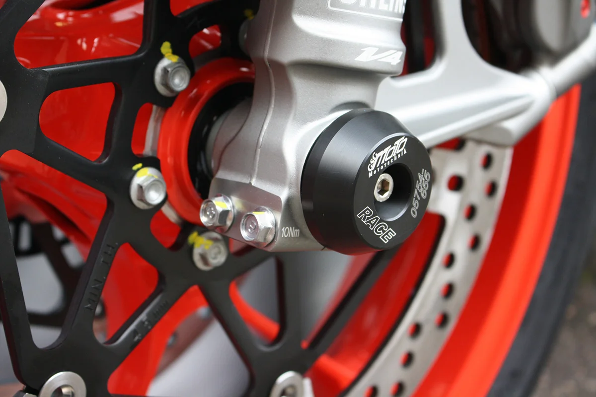 Защитные слайдеры переднего колеса GSG надежно предохраняют переднюю часть мотоцикла от ударов и протирания. При падении мотоцикл ложится на них и контролируемо скользит до остановки. Форма головки просчитана таким образом, чтобы не зацепиться за неровности асфальта, не повредить место крепления и не перевернуть мотоцикл. Качество слайдеров GSG подтверждено 30-летним производством и использованием на дороге и на гоночных треках. Крепёж входит в комплект.