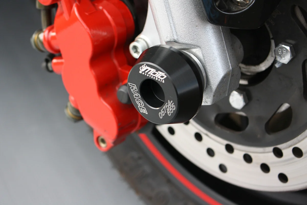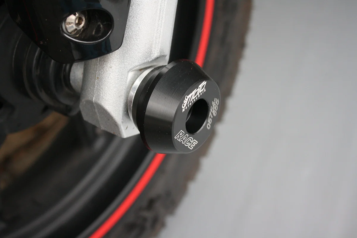 Защитные слайдеры переднего колеса GSG надежно предохраняют переднюю часть мотоцикла от ударов и протирания. При падении мотоцикл ложится на них и контролируемо скользит до остановки. Форма головки просчитана таким образом, чтобы не зацепиться за неровности асфальта, не повредить место крепления и не перевернуть мотоцикл. Качество слайдеров GSG подтверждено 30-летним производством и использованием на дороге и на гоночных треках. Слайдеры устанавливаются на полую ось переднего колеса с помощью шпильки. Крепёж входит в комплект.