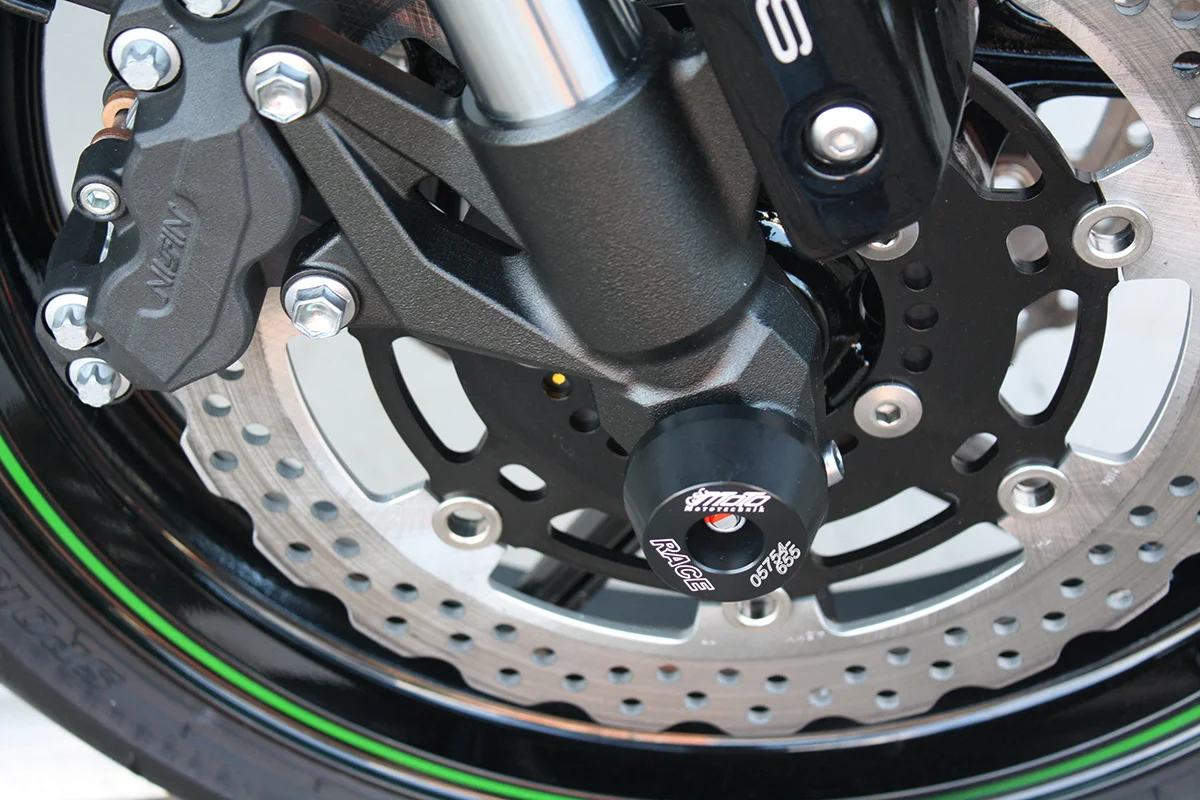 Защитные слайдеры переднего колеса GSG надежно предохраняют переднюю часть мотоцикла от ударов и протирания. При падении мотоцикл ложится на них и контролируемо скользит до остановки. Форма головки просчитана таким образом, чтобы не зацепиться за неровности асфальта, не повредить место крепления и не перевернуть мотоцикл. Качество слайдеров GSG подтверждено 30-летним производством и использованием на дороге и на гоночных треках. Слайдеры устанавливаются на полую ось переднего колеса с помощью шпильки. Крепёж входит в комплект.