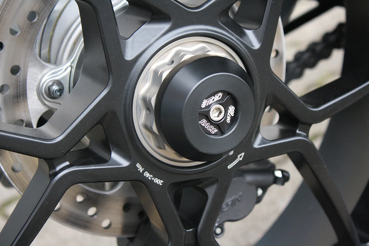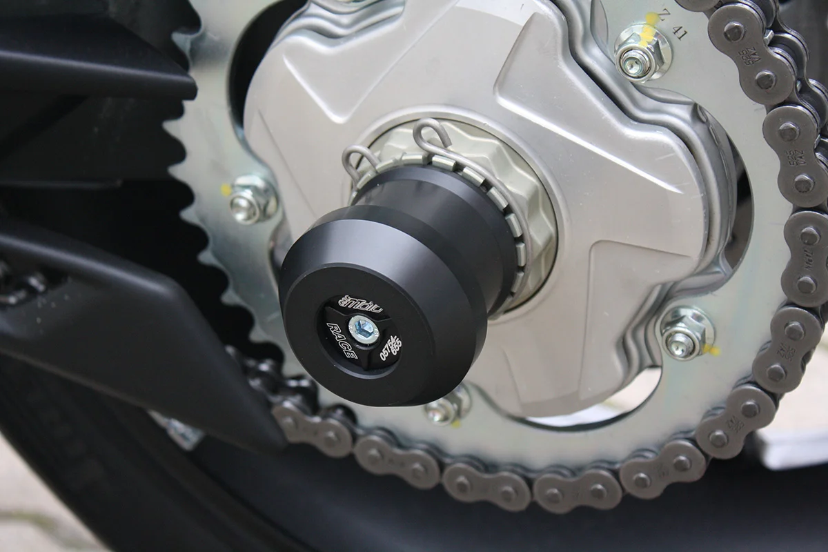 Защитные слайдеры заднего колеса GSG надежно предохраняют заднюю часть мотоцикла от ударов и протирания. При падении мотоцикл ложится на них и контролируемо скользит до остановки. Форма головки просчитана таким образом, чтобы не зацепиться за неровности асфальта, не повредить место крепления и не перевернуть мотоцикл. Качество слайдеров GSG подтверждено 30-летним производством и использованием на дороге и на гоночных треках. Слайдеры устанавливаются на ось заднего колеса с помощью резиновых втулок. Крепёж входит в комплект.