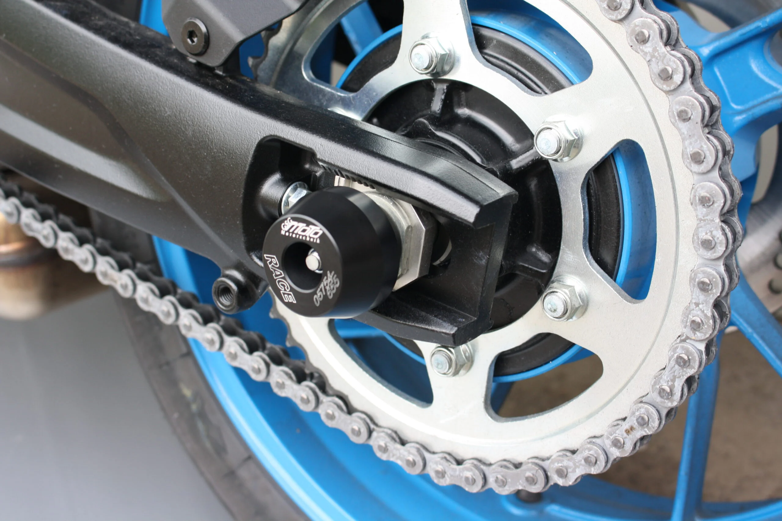 Слайдеры оси заднего колеса на шпильке GSG защищают заднюю часть мотоцикла Suzuki при падениях. Они предотвращают повреждения оси, гайки, маятника, тормоза и прилегающих деталей. Установка простая, не требует специнструмента
