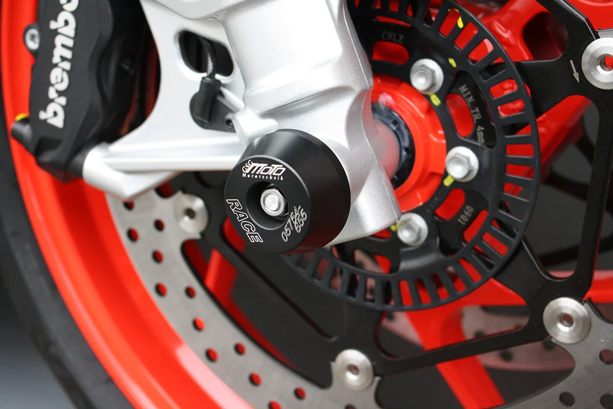 Защитные слайдеры переднего колеса GSG надежно предохраняют переднюю часть мотоцикла от ударов и протирания. При падении мотоцикл ложится на них и контролируемо скользит до остановки. Форма головки просчитана таким образом, чтобы не зацепиться за неровности асфальта, не повредить место крепления и не перевернуть мотоцикл. Качество слайдеров GSG подтверждено 30-летним производством и использованием на дороге и на гоночных треках. Слайдеры устанавливаются на полую ось переднего колеса с помощью шпильки. Крепёж входит в комплект.