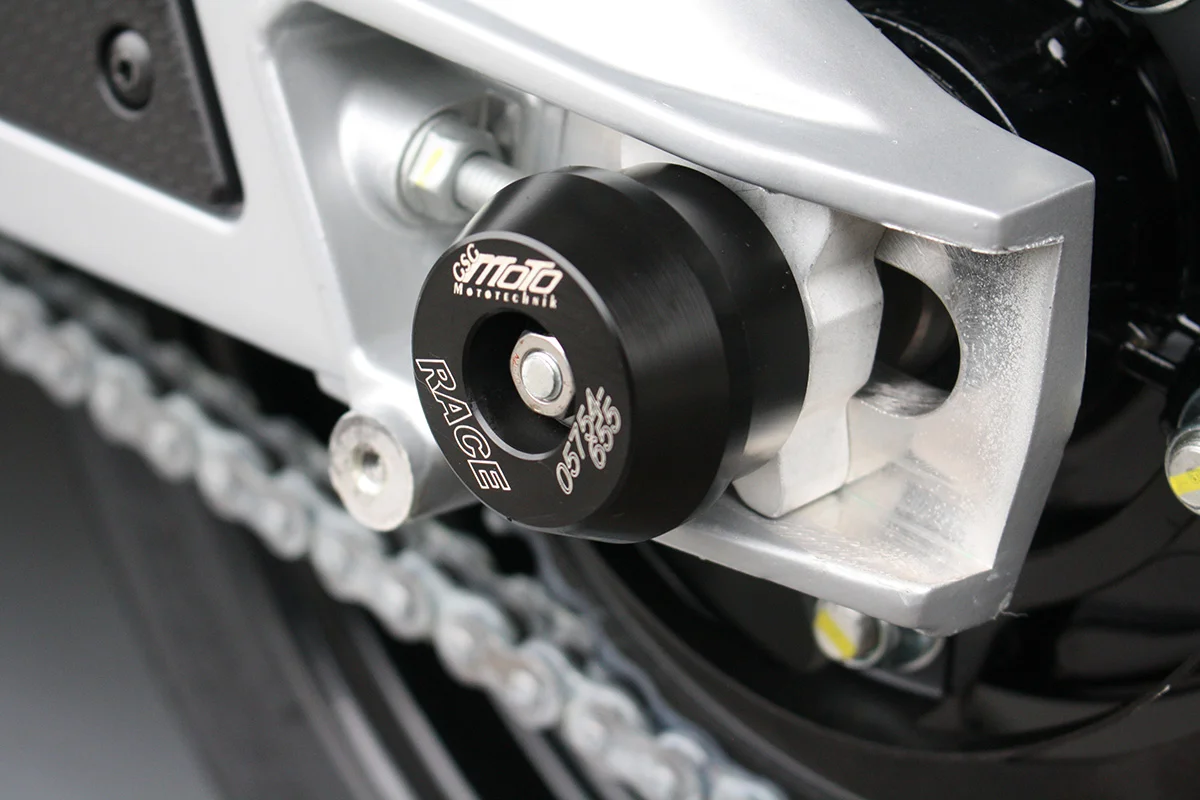 Защитные слайдеры заднего колеса GSG надежно предохраняют заднюю часть мотоцикла от ударов и протирания. При падении мотоцикл ложится на них и контролируемо скользит до остановки. Форма головки просчитана таким образом, чтобы не зацепиться за неровности асфальта, не повредить место крепления и не перевернуть мотоцикл. Качество слайдеров GSG подтверждено 30-летним производством и использованием на дороге и на гоночных треках. Слайдеры устанавливаются в ось заднего колеса с помощью шпильки. Крепёж входит в комплект.