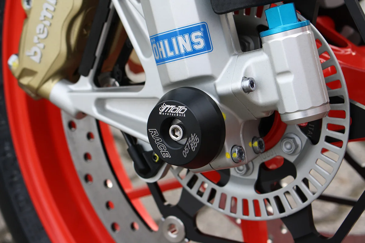Защитные слайдеры переднего колеса GSG надежно предохраняют переднюю часть мотоцикла от ударов и протирания. При падении мотоцикл ложится на них и контролируемо скользит до остановки. Форма головки просчитана таким образом, чтобы не зацепиться за неровности асфальта, не повредить место крепления и не перевернуть мотоцикл. Качество слайдеров GSG подтверждено 30-летним производством и использованием на дороге и на гоночных треках. Крепёж входит в комплект.