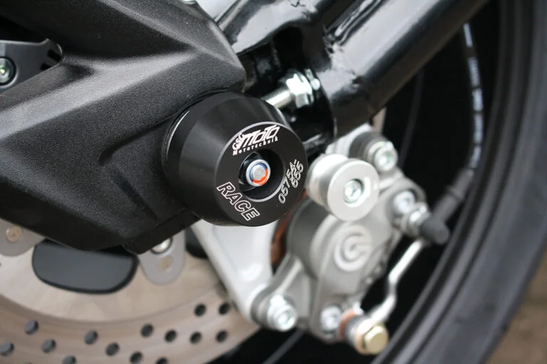 Защитные слайдеры заднего колеса GSG надежно предохраняют заднюю часть мотоцикла от ударов и протирания. При падении мотоцикл ложится на них и контролируемо скользит до остановки. Форма головки просчитана таким образом, чтобы не зацепиться за неровности асфальта, не повредить место крепления и не перевернуть мотоцикл. Качество слайдеров GSG подтверждено 30-летним производством и использованием на дороге и на гоночных треках. Слайдеры устанавливаются в ось заднего колеса с помощью шпильки. Крепёж входит в комплект.