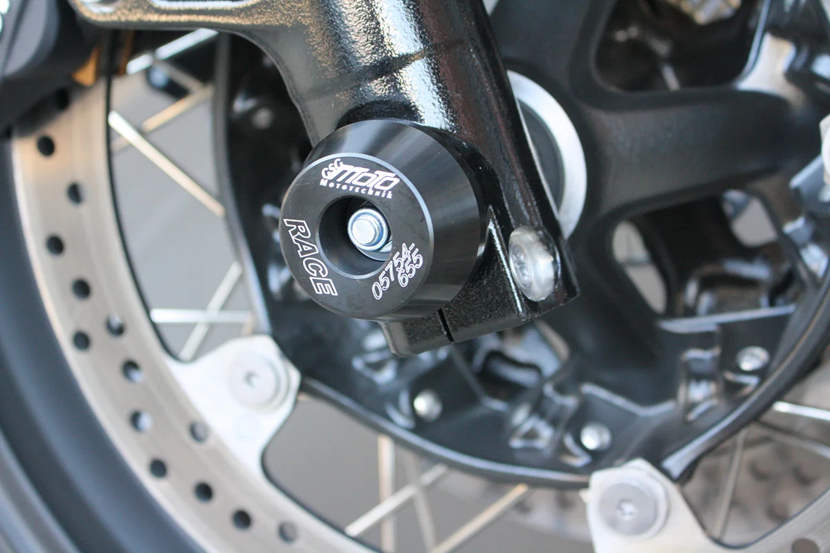 Слайдеры оси переднего колеса на шпильке защищают переднюю часть мотоцикла при падениях. Они предотвращают повреждения оси, гайки, нижней части вилки, тормоза и прилегающих деталей BMW R NineT. Установка простая, не требует специнструмента