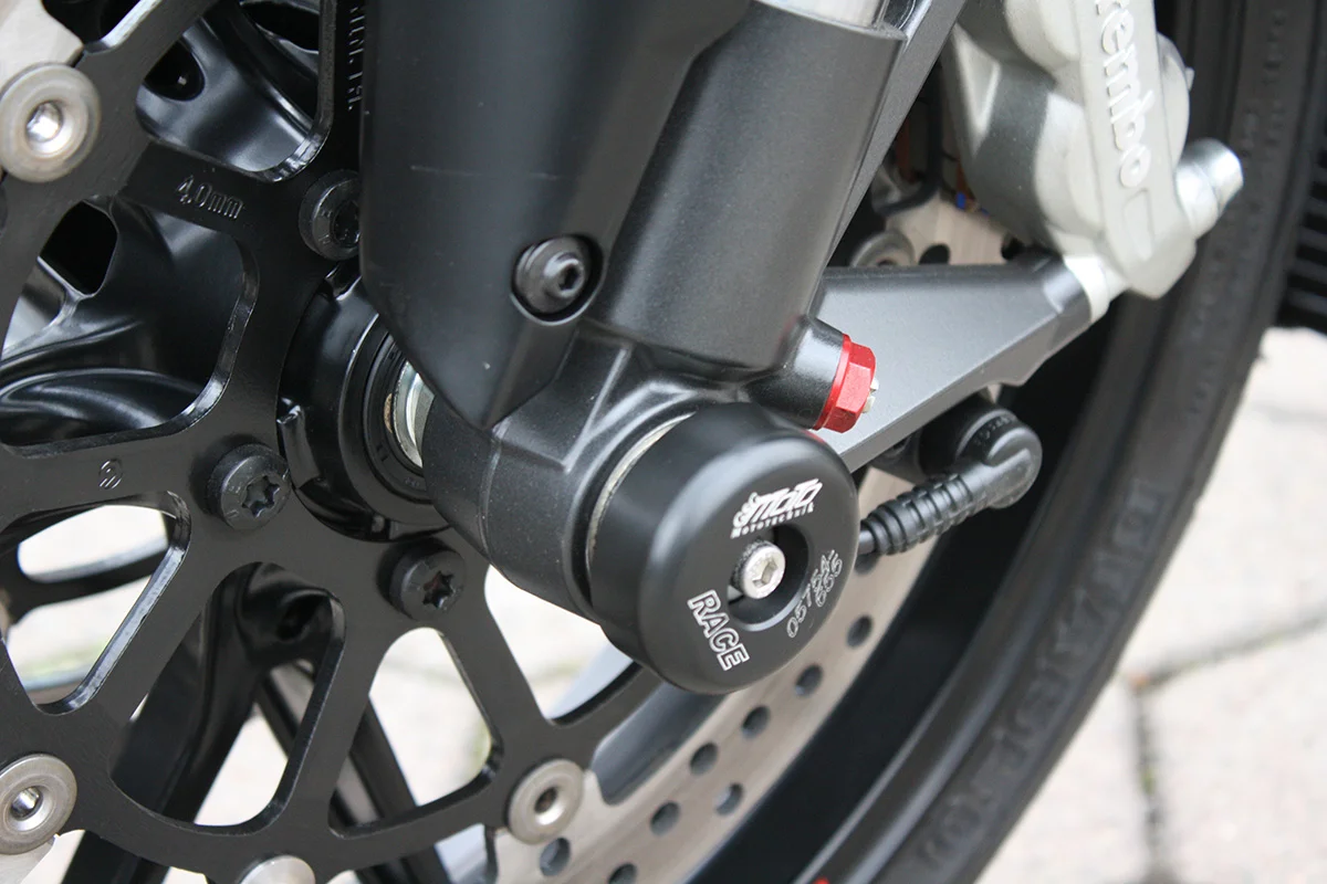 Защитные слайдеры переднего колеса GSG надежно защищают переднюю часть мотоцикла от ударов и протирания. При падении мотоцикл ложится на них и контролируемо скользит до остановки. Форма головки просчитана таким образом, чтобы не зацепиться за неровности асфальта, не повредить место крепления и не перевернуть мотоцикл. Качество слайдеров GSG подтверждено 30-летним производством и использованием на дороге и на гоночных треках. Слайдеры устанавливаются на ось переднего колеса с помощью резиновых втулок. Крепёж входит в комплект.