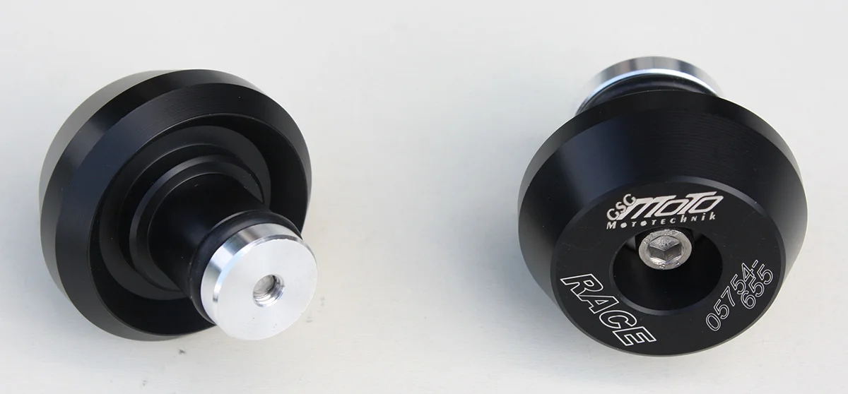 Защитные слайдеры переднего колеса GSG надежно защищают переднюю часть мотоцикла от ударов и протирания. При падении мотоцикл ложится на них и контролируемо скользит до остановки. Форма головки просчитана таким образом, чтобы не зацепиться за неровности асфальта, не повредить место крепления и не перевернуть мотоцикл. Качество слайдеров GSG подтверждено 30-летним производством и использованием на дороге и на гоночных треках. Слайдеры устанавливаются на ось переднего колеса с помощью резиновых втулок. Крепёж входит в комплект.