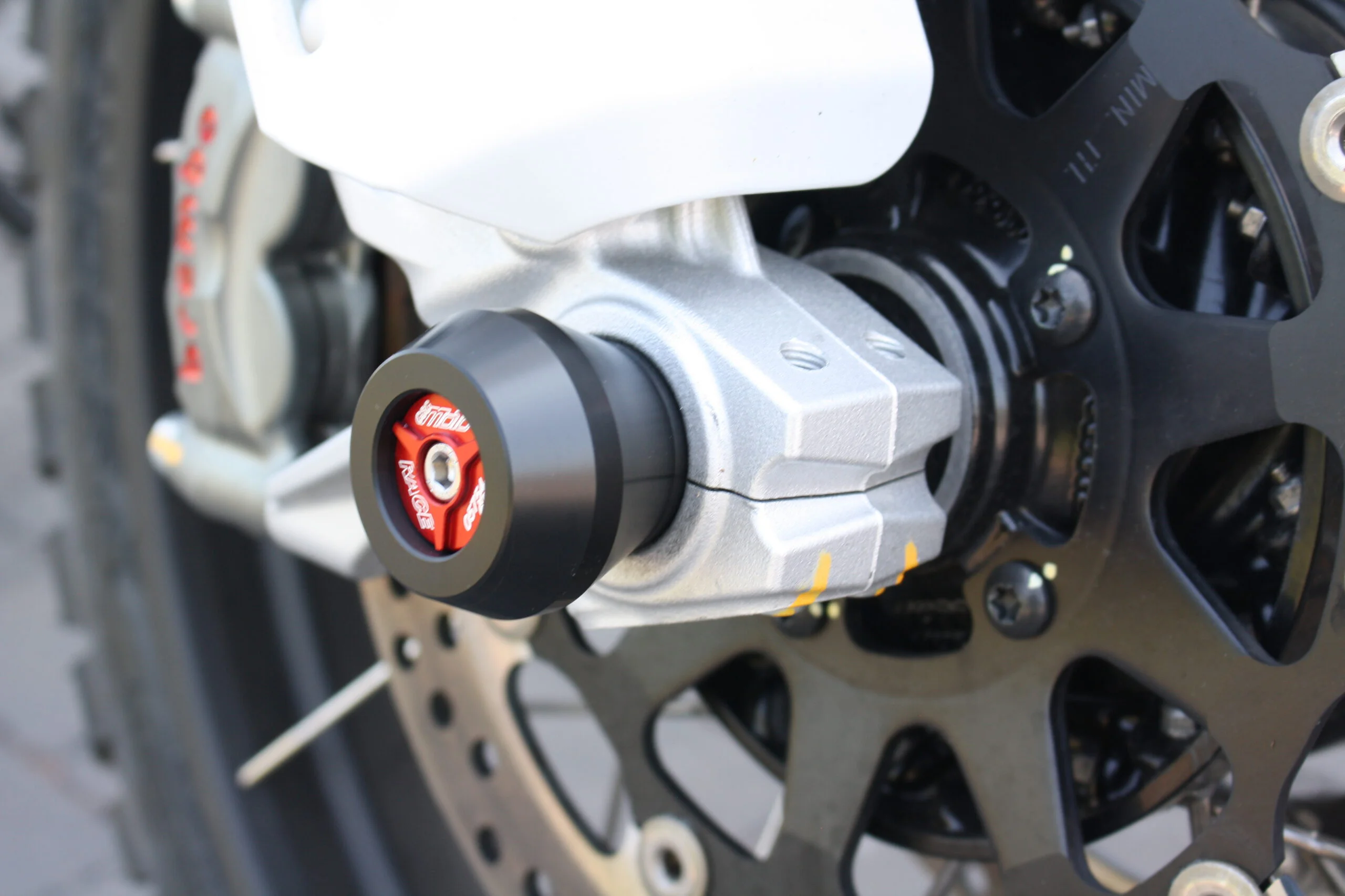 Защитные слайдеры переднего колеса GSG надежно защищают переднюю часть мотоцикла от ударов и протирания. При падении мотоцикл ложится на них и контролируемо скользит до остановки. Форма головки просчитана таким образом, чтобы не зацепиться за неровности асфальта, не повредить место крепления и не перевернуть мотоцикл. Качество слайдеров GSG подтверждено 30-летним производством и использованием на дороге и на гоночных треках. Слайдеры устанавливаются на ось переднего колеса с помощью резиновых втулок. Крепёж входит в комплект.