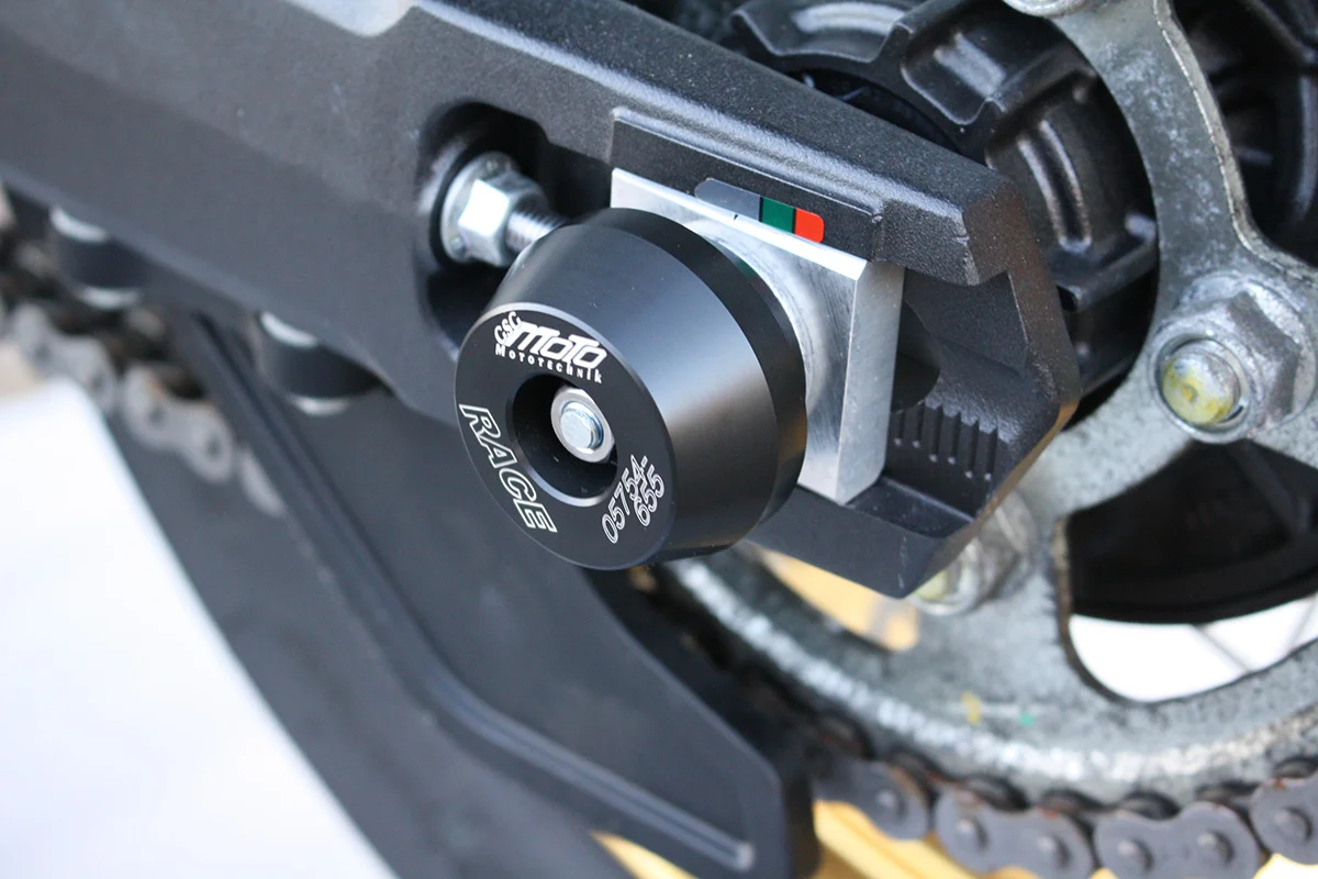 Защитные слайдеры заднего колеса GSG надежно защищают заднюю часть мотоцикла от ударов и протирания. При падении мотоцикл ложится на них и контролируемо скользит до остановки. Форма головки просчитана таким образом, чтобы не зацепиться за неровности асфальта, не повредить место крепления и не перевернуть мотоцикл. Качество слайдеров GSG подтверждено 30-летним производством и использованием на дороге и на гоночных треках. Слайдеры устанавливаются в ось заднего колеса с помощью шпильки. Крепёж входит в комплект.