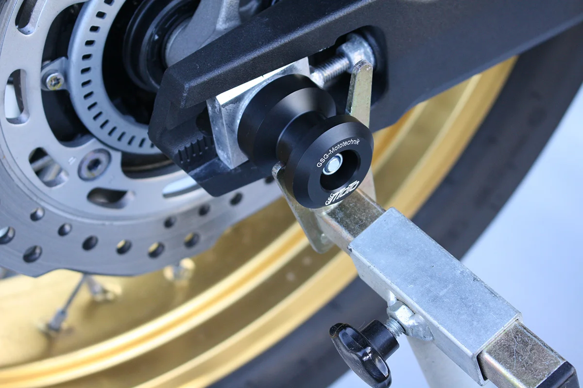 Защитные слайдеры заднего колеса GSG надежно защищают заднюю часть мотоцикла от ударов и протирания. При падении мотоцикл ложится на них и контролируемо скользит до остановки. Форма головки просчитана таким образом, чтобы не зацепиться за неровности асфальта, не повредить место крепления и не перевернуть мотоцикл. Качество слайдеров GSG подтверждено 30-летним производством и использованием на дороге и на гоночных треках. Слайдеры устанавливаются в ось заднего колеса с помощью шпильки. Крепёж входит в комплект.