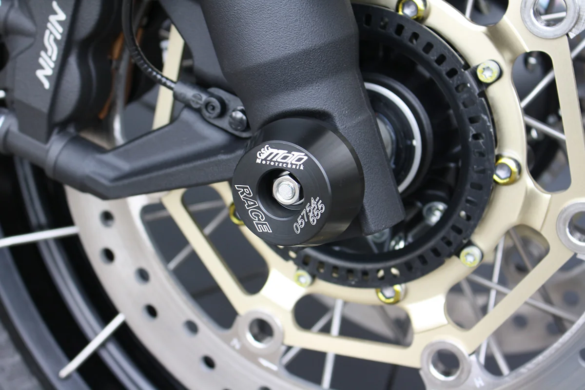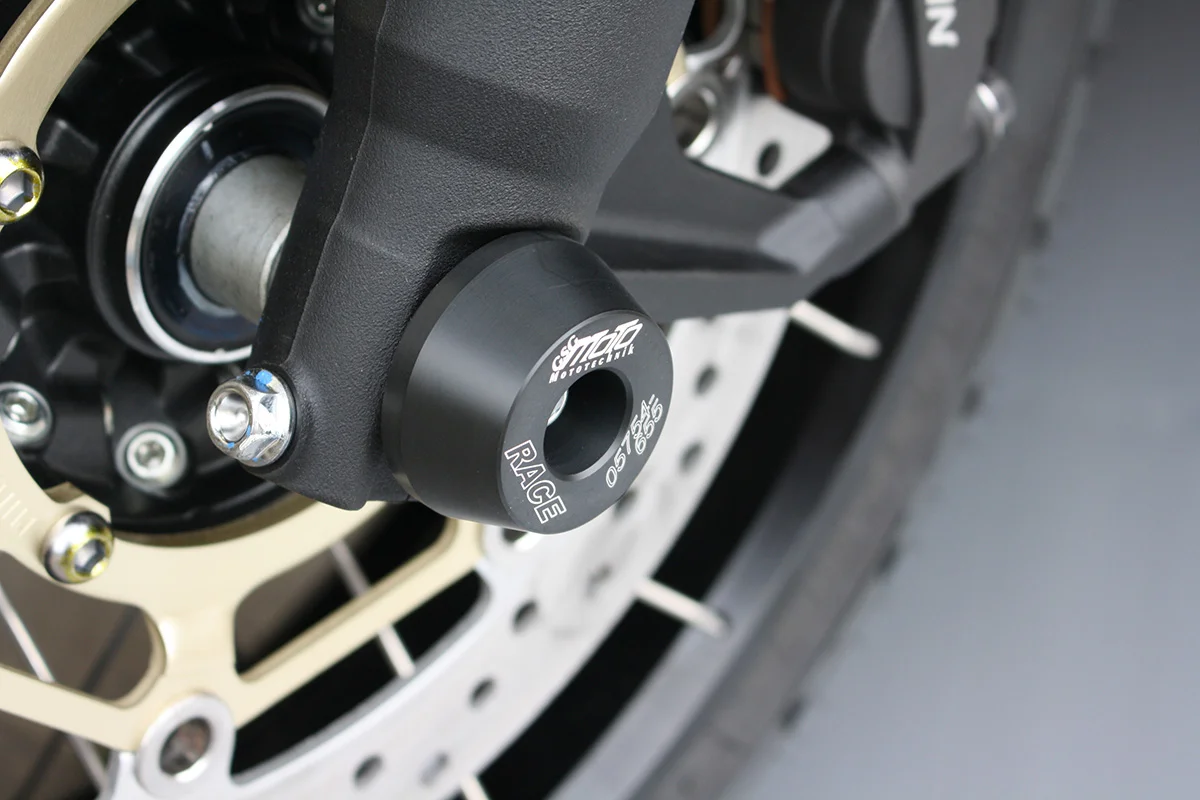 Защитные слайдеры переднего колеса GSG надежно предохраняют переднюю часть мотоцикла от ударов и протирания. При падении мотоцикл ложится на них и контролируемо скользит до остановки. Форма головки просчитана таким образом, чтобы не зацепиться за неровности асфальта, не повредить место крепления и не перевернуть мотоцикл. Качество слайдеров GSG подтверждено 30-летним производством и использованием на дороге и на гоночных треках. Слайдеры устанавливаются на полую ось переднего колеса с помощью шпильки. Крепёж входит в комплект.
