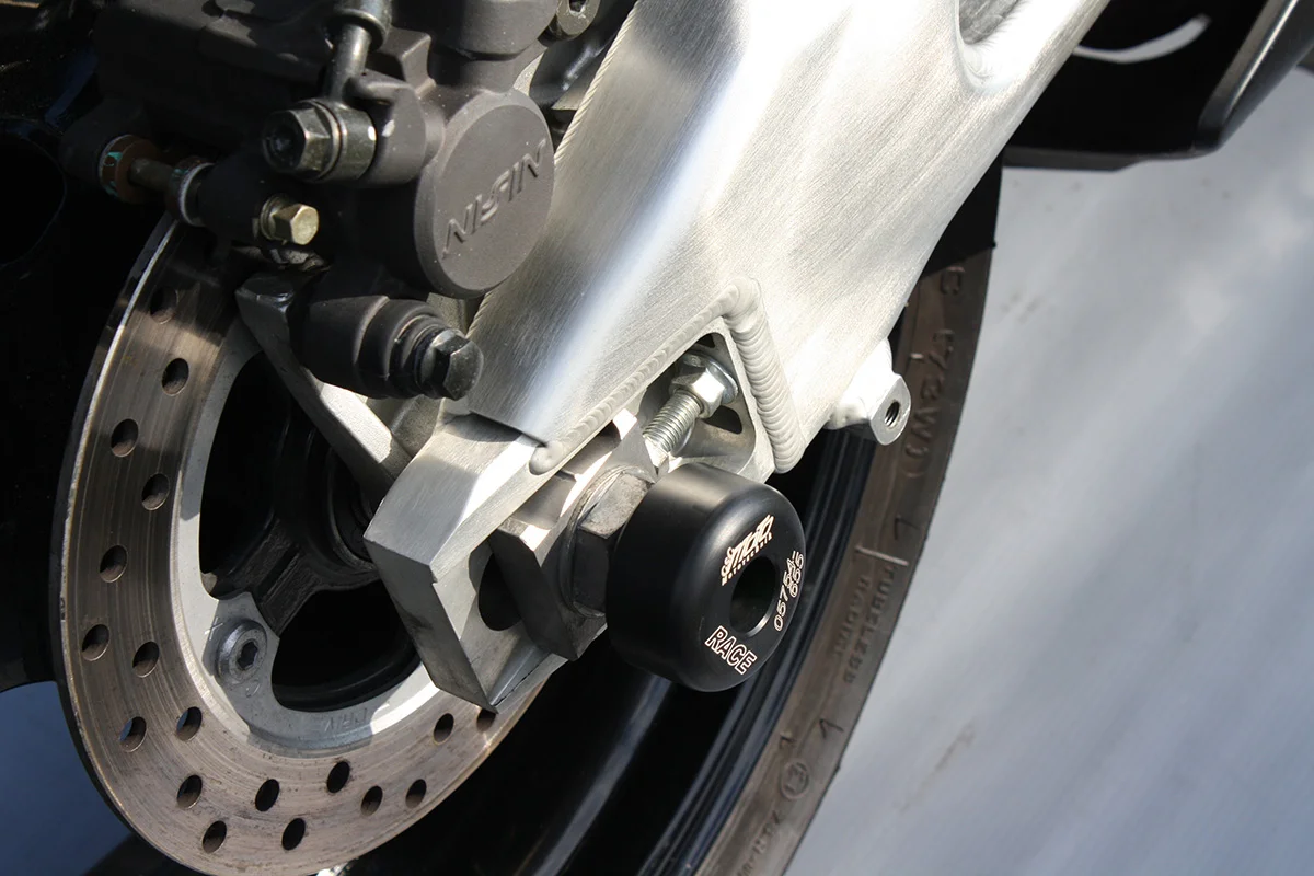 Защитные слайдеры заднего колеса GSG надежно защищают заднюю часть мотоцикла от ударов и протирания. При падении мотоцикл ложится на них и контролируемо скользит до остановки. Форма головки просчитана таким образом, чтобы не зацепиться за неровности асфальта, не повредить место крепления и не перевернуть мотоцикл. Качество слайдеров GSG подтверждено 30-летним производством и использованием на дороге и на гоночных треках. Слайдеры устанавливаются в ось заднего колеса с помощью шпильки. Крепёж входит в комплект.