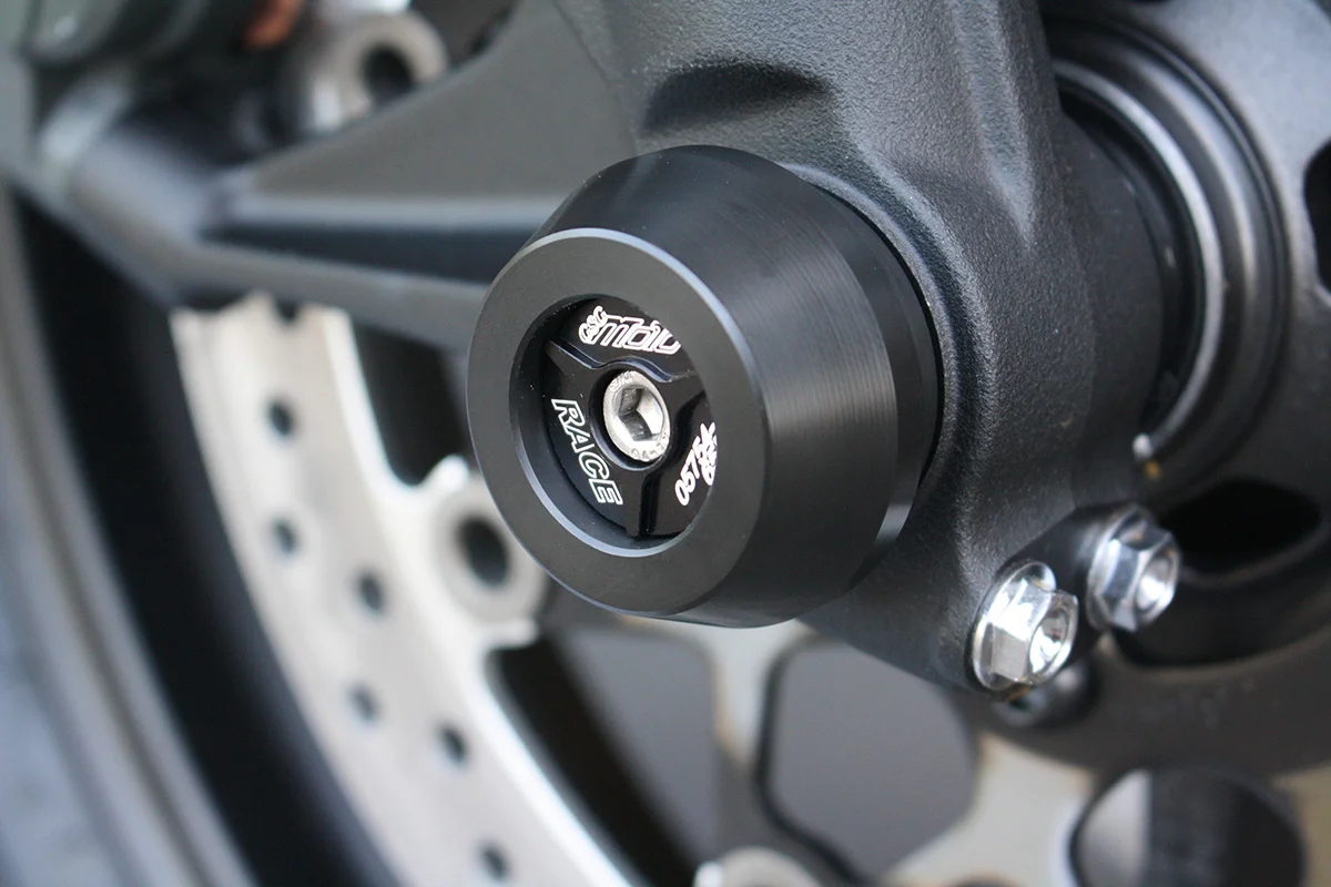 Защитные слайдеры переднего колеса GSG надежно предохраняют переднюю часть мотоцикла от ударов и протирания. При падении мотоцикл ложится на них и контролируемо скользит до остановки. Форма головки просчитана таким образом, чтобы не зацепиться за неровности асфальта, не повредить место крепления и не перевернуть мотоцикл. Качество слайдеров GSG подтверждено 30-летним производством и использованием на дороге и на гоночных треках. Слайдеры устанавливаются на ось переднего колеса с помощью резиновых втулок. Крепёж входит в комплект.