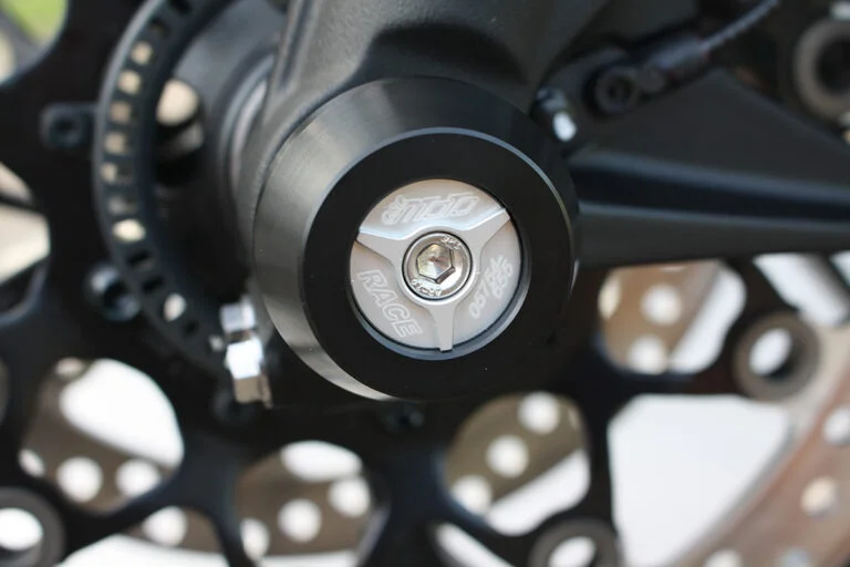 Защитные слайдеры переднего колеса GSG надежно предохраняют переднюю часть мотоцикла от ударов и протирания. При падении мотоцикл ложится на них и контролируемо скользит до остановки. Форма головки просчитана таким образом, чтобы не зацепиться за неровности асфальта, не повредить место крепления и не перевернуть мотоцикл. Качество слайдеров GSG подтверждено 30-летним производством и использованием на дороге и на гоночных треках. Слайдеры устанавливаются на ось переднего колеса с помощью резиновых втулок. Крепёж входит в комплект.