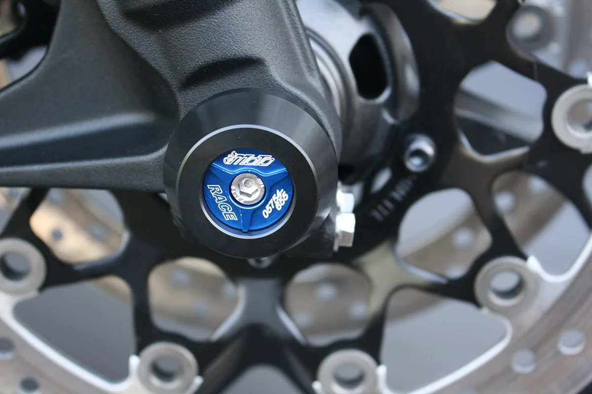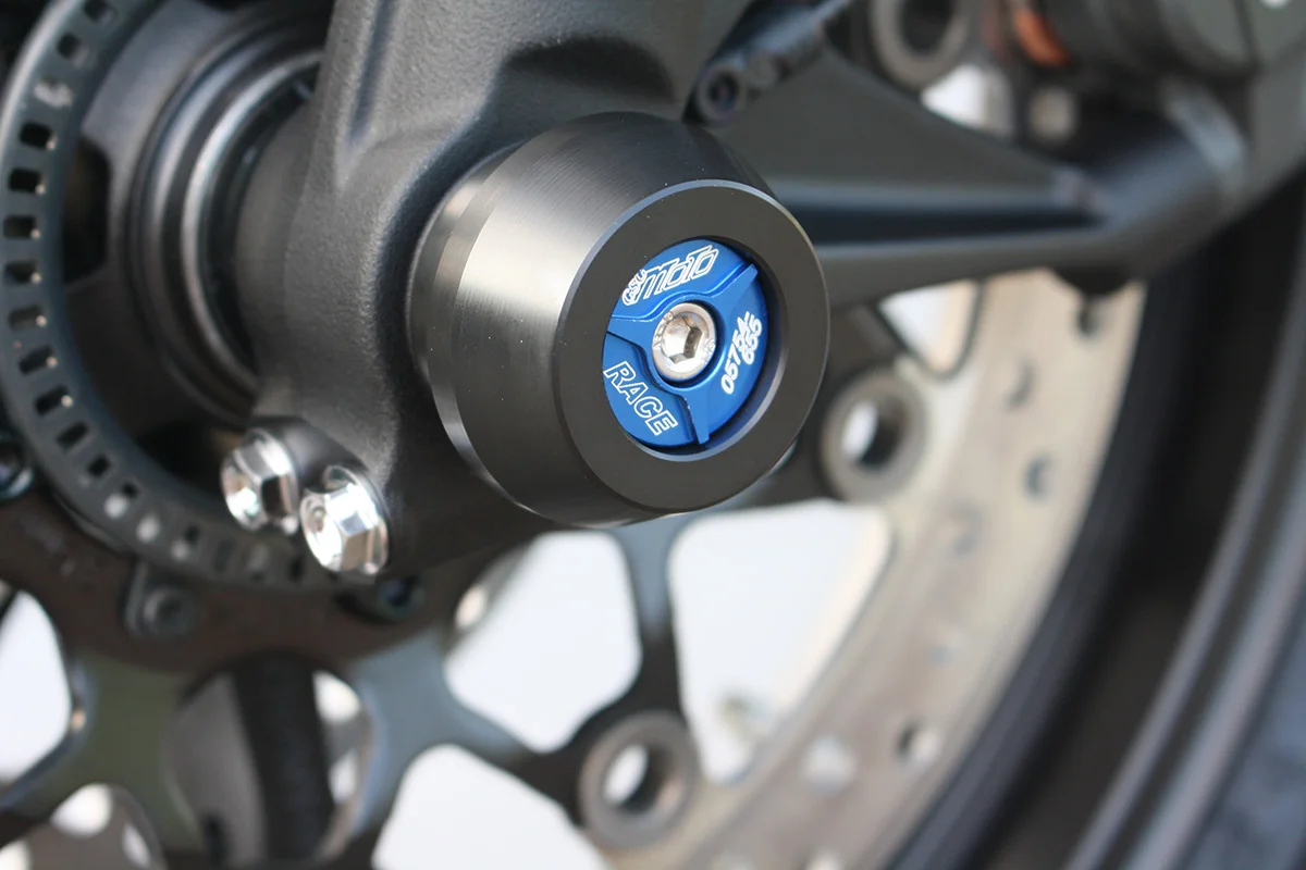 Защитные слайдеры переднего колеса GSG надежно предохраняют переднюю часть мотоцикла от ударов и протирания. При падении мотоцикл ложится на них и контролируемо скользит до остановки. Форма головки просчитана таким образом, чтобы не зацепиться за неровности асфальта, не повредить место крепления и не перевернуть мотоцикл. Качество слайдеров GSG подтверждено 30-летним производством и использованием на дороге и на гоночных треках. Слайдеры устанавливаются на ось переднего колеса с помощью резиновых втулок. Крепёж входит в комплект.