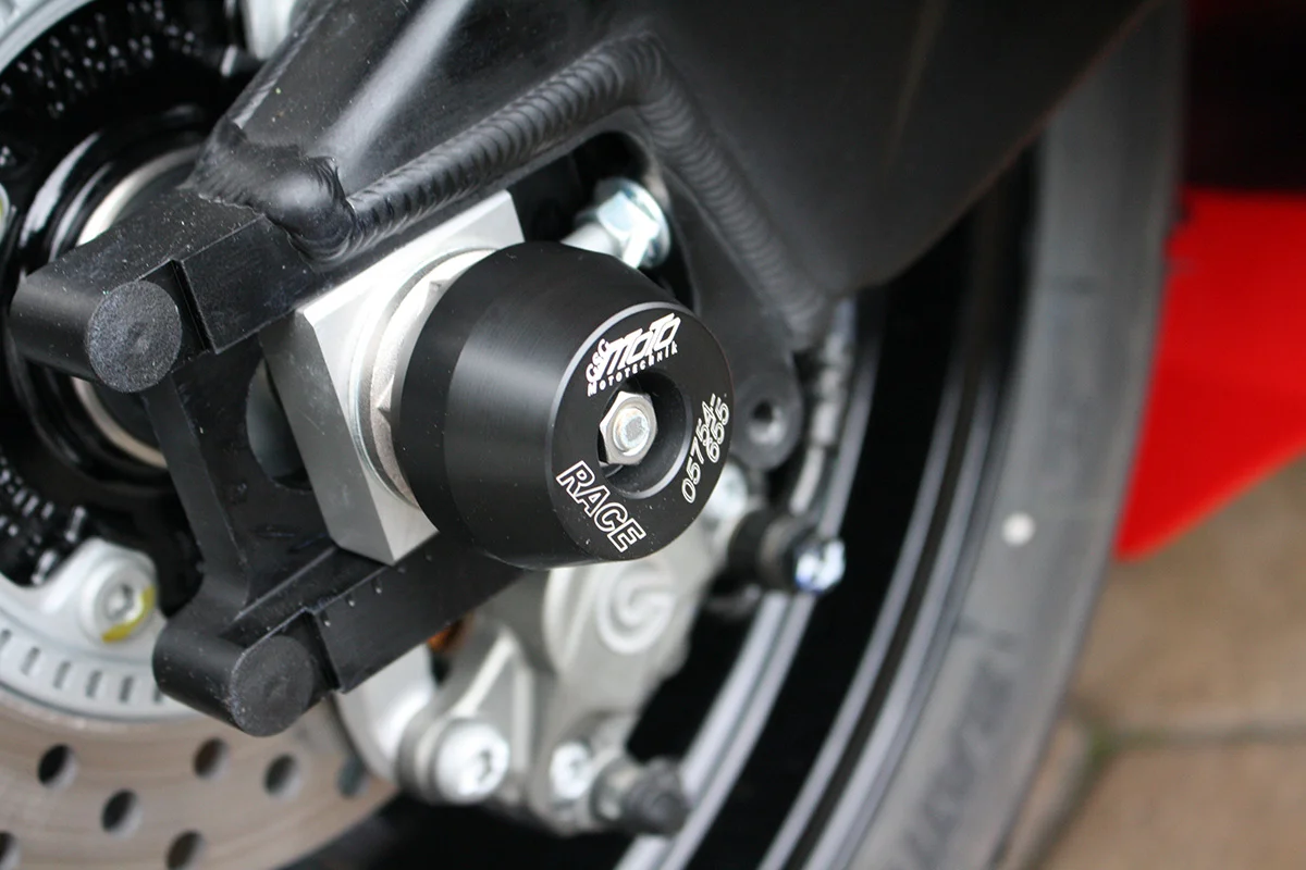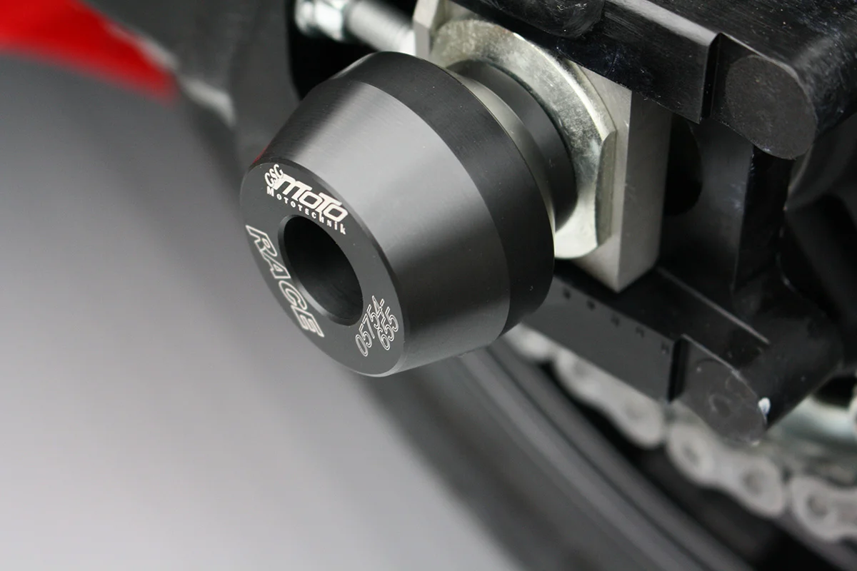 Защитные слайдеры заднего колеса GSG надежно защищают заднюю часть мотоцикла от ударов и протирания. При падении мотоцикл ложится на них и контролируемо скользит до остановки. Форма головки просчитана таким образом, чтобы не зацепиться за неровности асфальта, не повредить место крепления и не перевернуть мотоцикл. Качество слайдеров GSG подтверждено 30-летним производством и использованием на дороге и на гоночных треках. Слайдеры устанавливаются в ось заднего колеса с помощью шпильки. Крепёж входит в комплект.