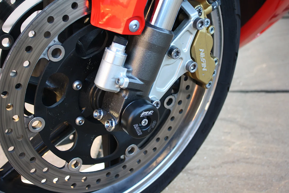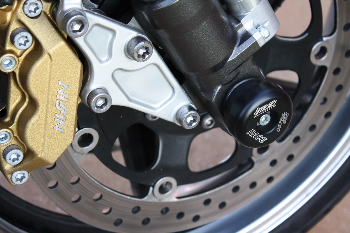 Защитные слайдеры переднего колеса GSG надежно защищают переднюю часть мотоцикла от ударов и протирания. При падении мотоцикл ложится на них и контролируемо скользит до остановки. Форма головки просчитана таким образом, чтобы не зацепиться за неровности асфальта, не повредить место крепления и не перевернуть мотоцикл. Качество слайдеров GSG подтверждено 30-летним производством и использованием на дороге и на гоночных треках. Слайдеры устанавливаются на ось переднего колеса с помощью резиновых втулок. Крепёж входит в комплект.