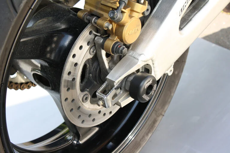Защитные слайдеры заднего колеса GSG надежно защищают заднюю часть мотоцикла от ударов и протирания. При падении мотоцикл ложится на них и контролируемо скользит до остановки. Форма головки просчитана таким образом, чтобы не зацепиться за неровности асфальта, не повредить место крепления и не перевернуть мотоцикл. Качество слайдеров GSG подтверждено 30-летним производством и использованием на дороге и на гоночных треках. Слайдеры устанавливаются в ось заднего колеса с помощью шпильки. Крепёж входит в комплект.