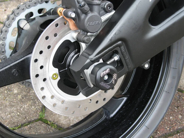 Защитные слайдеры заднего колеса GSG надежно защищают заднюю часть мотоцикла от ударов и протирания. При падении мотоцикл ложится на них и контролируемо скользит до остановки. Форма головки просчитана таким образом, чтобы не зацепиться за неровности асфальта, не повредить место крепления и не перевернуть мотоцикл. Качество слайдеров GSG подтверждено 30-летним производством и использованием на дороге и на гоночных треках. Слайдеры устанавливаются в ось заднего колеса с помощью шпильки. Крепёж входит в комплект.