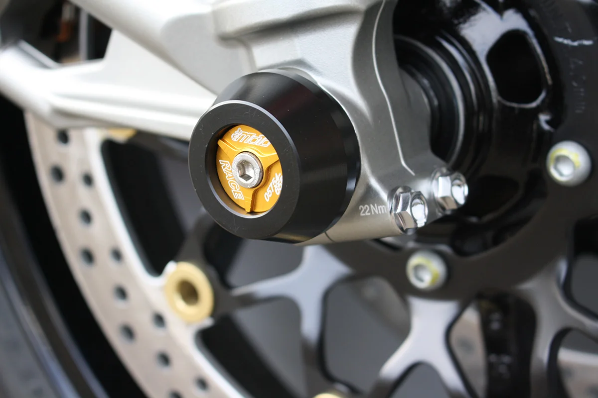 Защитные слайдеры переднего колеса GSG надежно предохраняют переднюю часть мотоцикла от ударов и протирания. При падении мотоцикл ложится на них и контролируемо скользит до остановки. Форма головки просчитана таким образом, чтобы не зацепиться за неровности асфальта, не повредить место крепления и не перевернуть мотоцикл. Качество слайдеров GSG подтверждено 30-летним производством и использованием на дороге и на гоночных треках. Слайдеры устанавливаются на ось переднего колеса с помощью резиновых втулок. Крепёж входит в комплект.