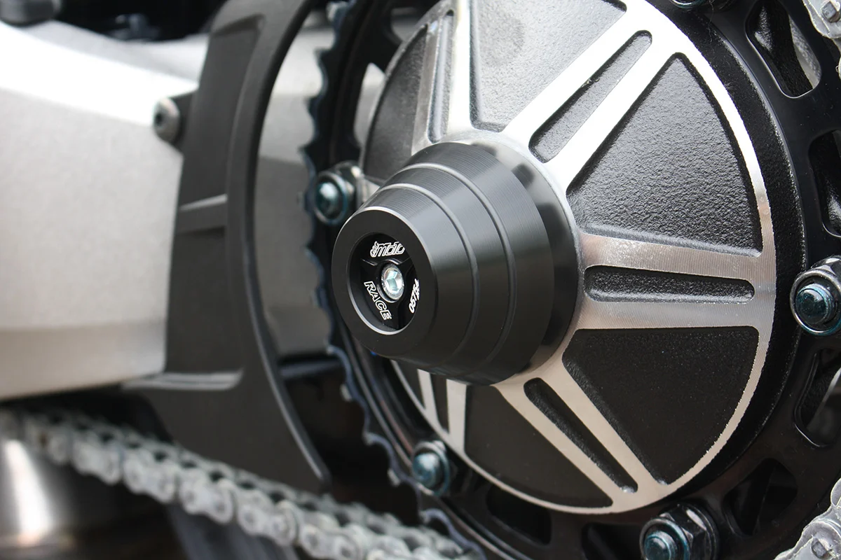 Защитные слайдеры заднего колеса GSG надежно предохраняют заднюю часть мотоцикла от ударов и протирания. При падении мотоцикл ложится на них и контролируемо скользит до остановки. Форма головки просчитана таким образом, чтобы не зацепиться за неровности асфальта, не повредить место крепления и не перевернуть мотоцикл. Качество слайдеров GSG подтверждено 30-летним производством и использованием на дороге и на гоночных треках. Слайдеры устанавливаются на ось заднего колеса с помощью резиновых втулок. Крепёж входит в комплект.
