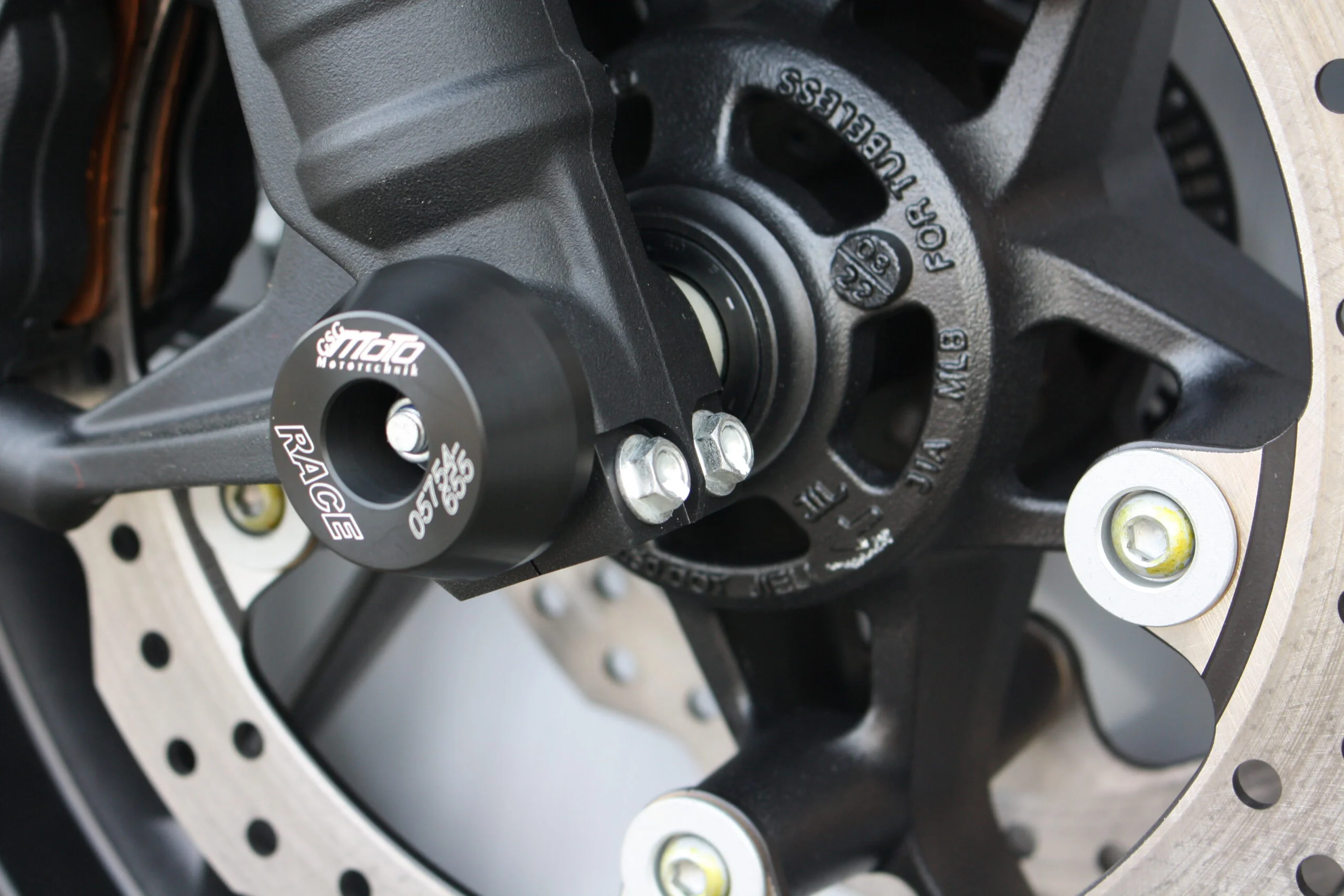 Защитные слайдеры переднего колеса GSG надежно предохраняют переднюю часть мотоцикла от ударов и протирания. При падении мотоцикл ложится на них и контролируемо скользит до остановки. Форма головки просчитана таким образом, чтобы не зацепиться за неровности асфальта, не повредить место крепления и не перевернуть мотоцикл. Качество слайдеров GSG подтверждено 30-летним производством и использованием на дороге и на гоночных треках. Слайдеры устанавливаются на полую ось переднего колеса с помощью шпильки. Крепёж входит в комплект.