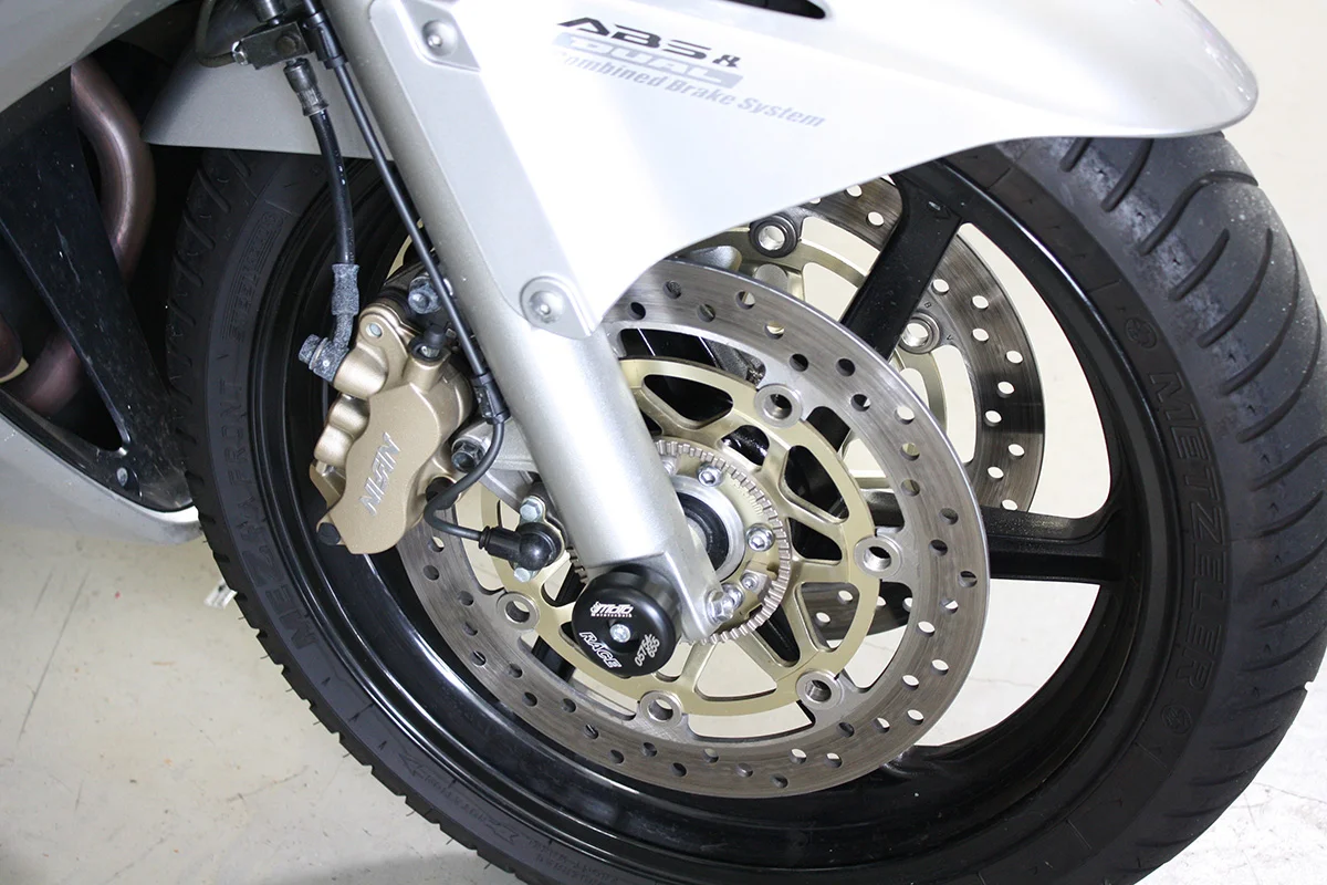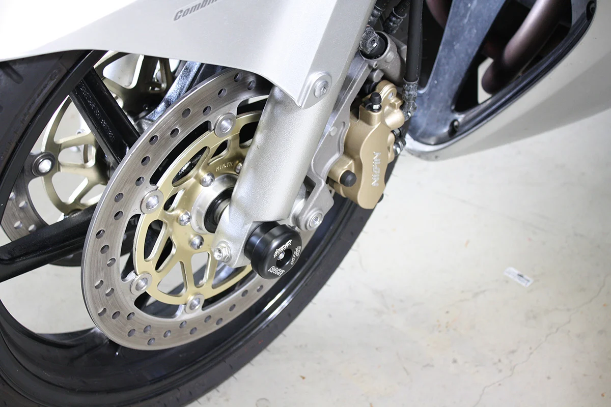 Защитные слайдеры переднего колеса GSG надежно защищают переднюю часть мотоцикла от ударов и протирания. При падении мотоцикл ложится на них и контролируемо скользит до остановки. Форма головки просчитана таким образом, чтобы не зацепиться за неровности асфальта, не повредить место крепления и не перевернуть мотоцикл. Качество слайдеров GSG подтверждено 30-летним производством и использованием на дороге и на гоночных треках. Слайдеры устанавливаются на полую ось переднего колеса с помощью шпильки. Крепёж входит в комплект.