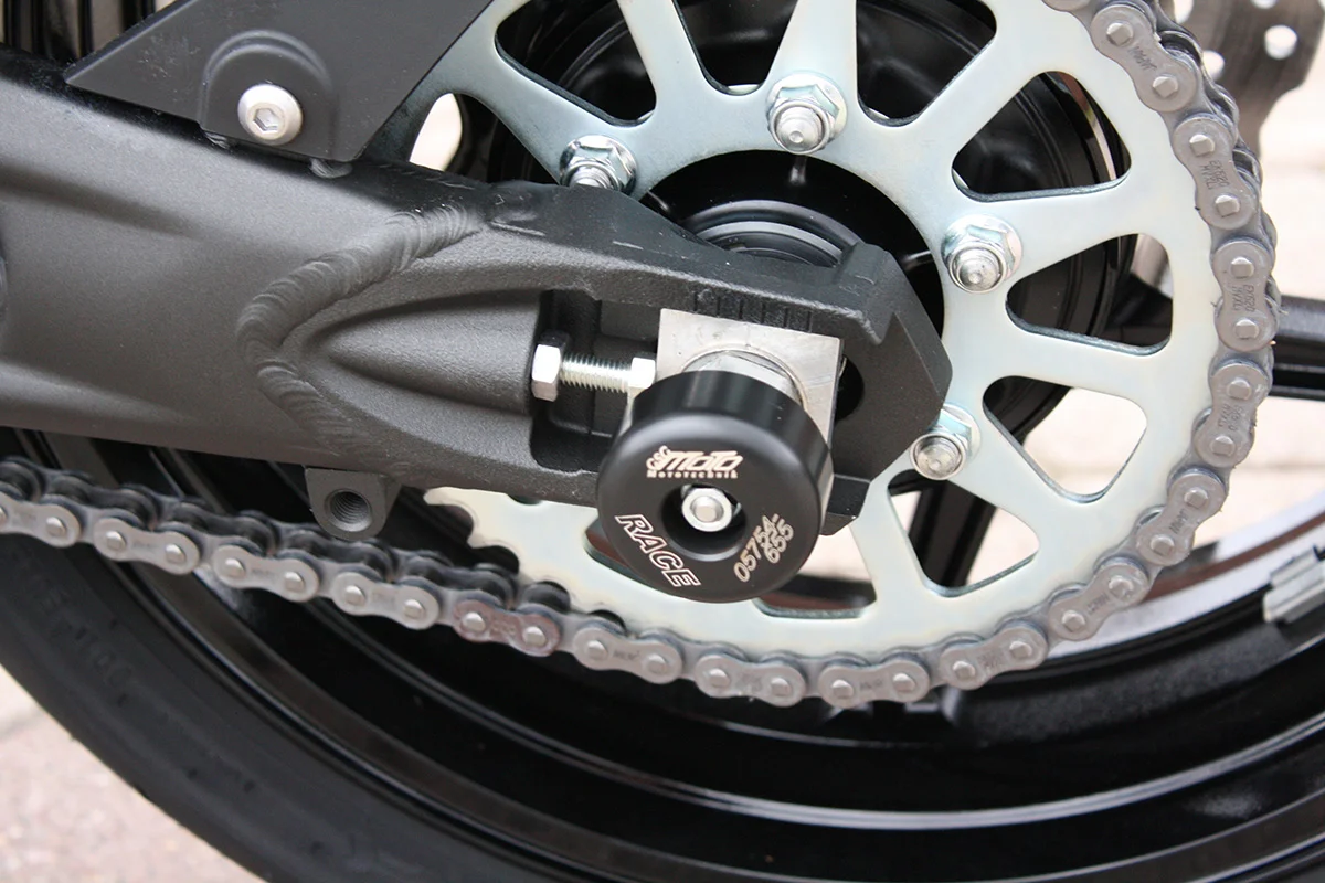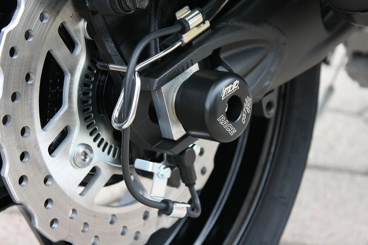 Защитные слайдеры заднего колеса GSG надежно предохраняют заднюю часть мотоцикла от ударов и протирания. При падении мотоцикл ложится на них и контролируемо скользит до остановки. Форма головки просчитана таким образом, чтобы не зацепиться за неровности асфальта, не повредить место крепления и не перевернуть мотоцикл. Качество слайдеров GSG подтверждено 30-летним производством и использованием на дороге и на гоночных треках. Слайдеры устанавливаются в ось заднего колеса с помощью шпильки. Крепёж входит в комплект.