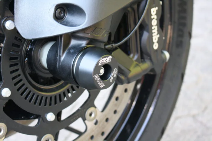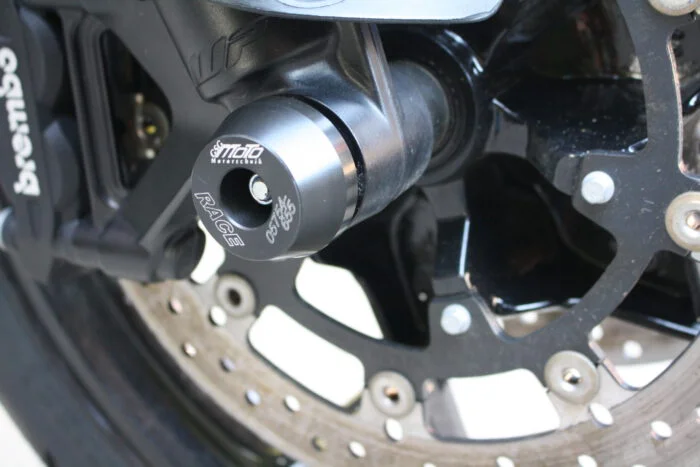 Защитные слайдеры переднего колеса GSG надежно предохраняют переднюю часть мотоцикла от ударов и протирания. При падении мотоцикл ложится на них и контролируемо скользит до остановки. Форма головки просчитана таким образом, чтобы не зацепиться за неровности асфальта, не повредить место крепления и не перевернуть мотоцикл. Качество слайдеров GSG подтверждено 30-летним производством и использованием на дороге и на гоночных треках. Слайдеры устанавливаются на полую ось переднего колеса с помощью шпильки. Крепёж входит в комплект.