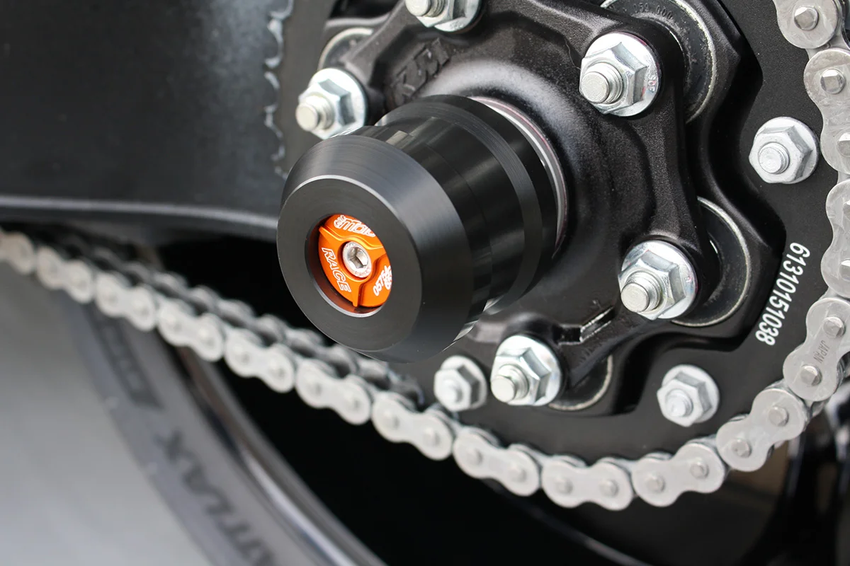 Защитные слайдеры заднего колеса GSG надежно предохраняют заднюю часть мотоцикла от ударов и протирания. При падении мотоцикл ложится на них и контролируемо скользит до остановки. Форма головки просчитана таким образом, чтобы не зацепиться за неровности асфальта, не повредить место крепления и не перевернуть мотоцикл. Качество слайдеров GSG подтверждено 30-летним производством и использованием на дороге и на гоночных треках. Слайдеры устанавливаются на ось заднего колеса с помощью резиновых втулок. Крепёж входит в комплект.