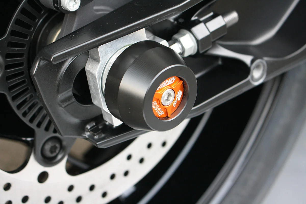 Защитные слайдеры заднего колеса GSG надежно предохраняют заднюю часть мотоцикла от ударов и протирания. При падении мотоцикл ложится на них и контролируемо скользит до остановки. Форма головки просчитана таким образом, чтобы не зацепиться за неровности асфальта, не повредить место крепления и не перевернуть мотоцикл. Качество слайдеров GSG подтверждено 30-летним производством и использованием на дороге и на гоночных треках. Слайдеры устанавливаются на ось заднего колеса с помощью резиновых втулок. Крепёж входит в комплект.
