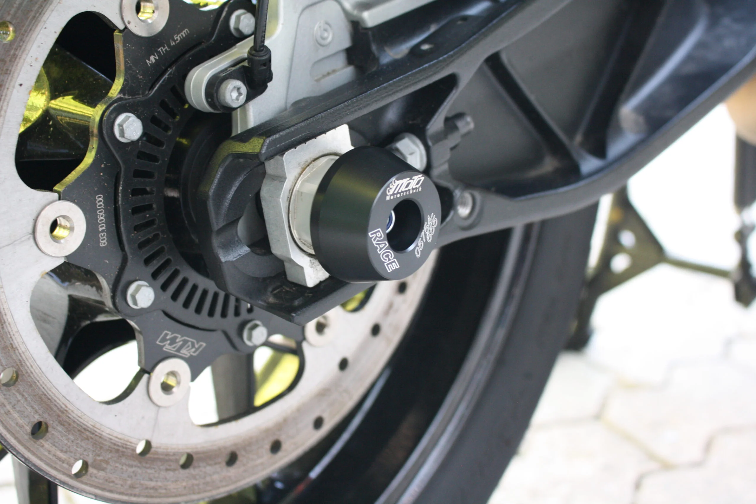 Защитные слайдеры заднего колеса GSG надежно предохраняют заднюю часть мотоцикла от ударов и протирания. При падении мотоцикл ложится на них и контролируемо скользит до остановки. Форма головки просчитана таким образом, чтобы не зацепиться за неровности асфальта, не повредить место крепления и не перевернуть мотоцикл. Качество слайдеров GSG подтверждено 30-летним производством и использованием на дороге и на гоночных треках. Слайдеры устанавливаются в ось заднего колеса с помощью шпильки. Крепёж входит в комплект.