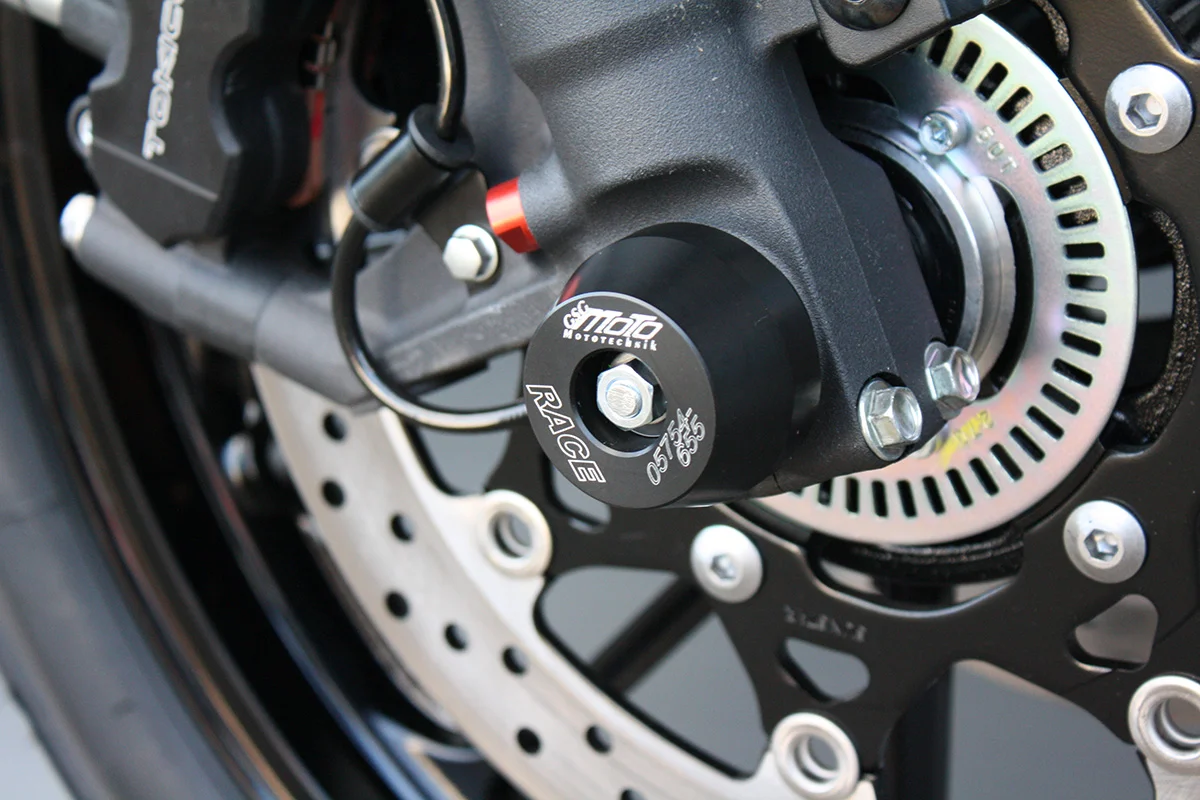 Защитные слайдеры переднего колеса GSG надежно предохраняют переднюю часть мотоцикла от ударов и протирания. При падении мотоцикл ложится на них и контролируемо скользит до остановки. Форма головки просчитана таким образом, чтобы не зацепиться за неровности асфальта, не повредить место крепления и не перевернуть мотоцикл. Качество слайдеров GSG подтверждено 30-летним производством и использованием на дороге и на гоночных треках. Слайдеры устанавливаются на полую ось переднего колеса с помощью шпильки. Крепёж входит в комплект.