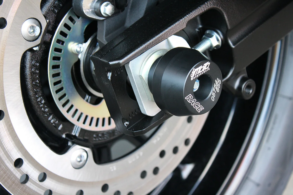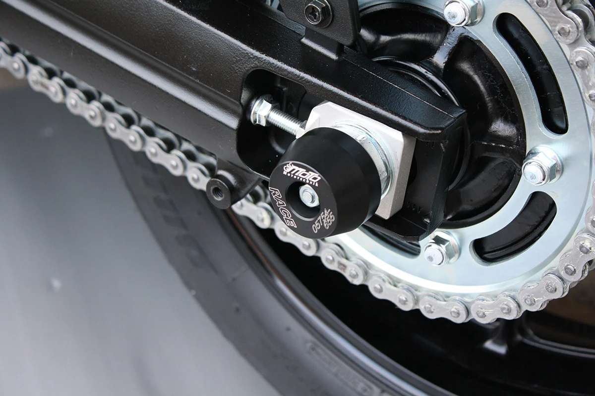 Слайдеры оси заднего колеса на шпильке GSG защищают заднюю часть мотоцикла Suzuki при падениях. Они предотвращают повреждения оси, гайки, маятника, тормоза и прилегающих деталей. Установка простая, не требует специнструмента