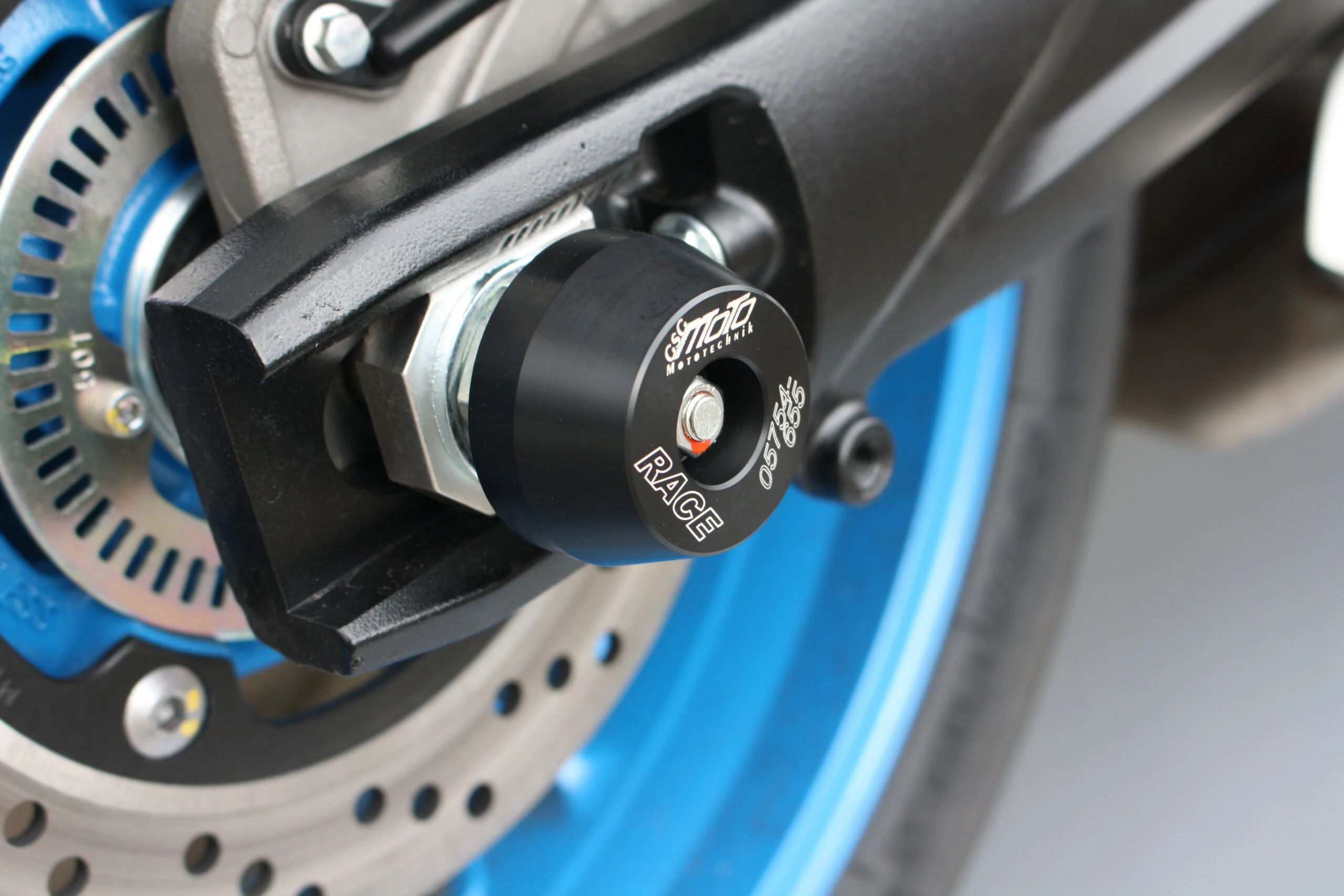 Слайдеры оси заднего колеса на шпильке GSG защищают заднюю часть мотоцикла Suzuki при падениях. Они предотвращают повреждения оси, гайки, маятника, тормоза и прилегающих деталей. Установка простая, не требует специнструмента