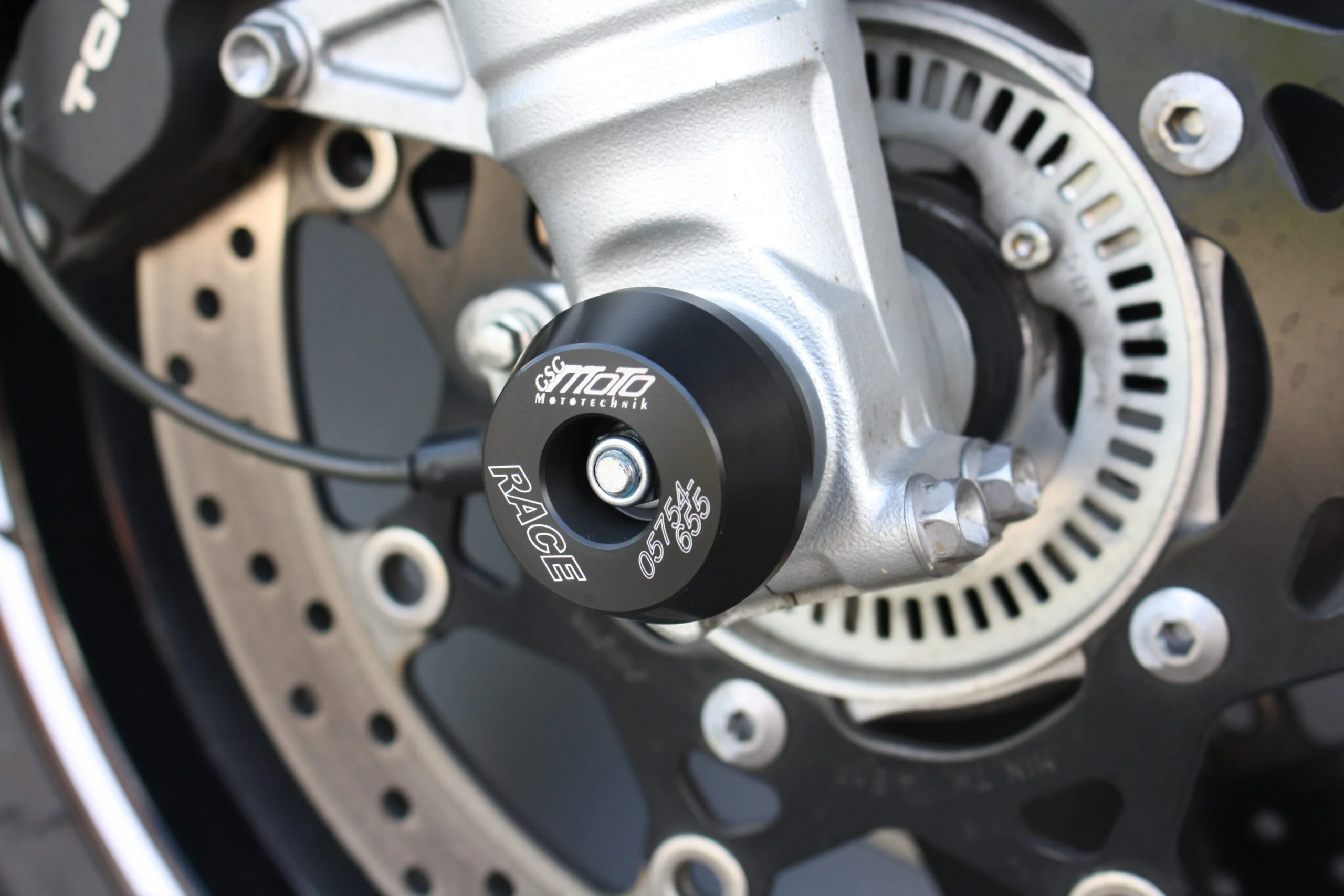 Защитные слайдеры переднего колеса GSG надежно предохраняют переднюю часть мотоцикла от ударов и протирания. При падении мотоцикл ложится на них и контролируемо скользит до остановки. Форма головки просчитана таким образом, чтобы не зацепиться за неровности асфальта, не повредить место крепления и не перевернуть мотоцикл. Качество слайдеров GSG подтверждено 30-летним производством и использованием на дороге и на гоночных треках. Слайдеры устанавливаются на полую ось переднего колеса с помощью шпильки. Крепёж входит в комплект.