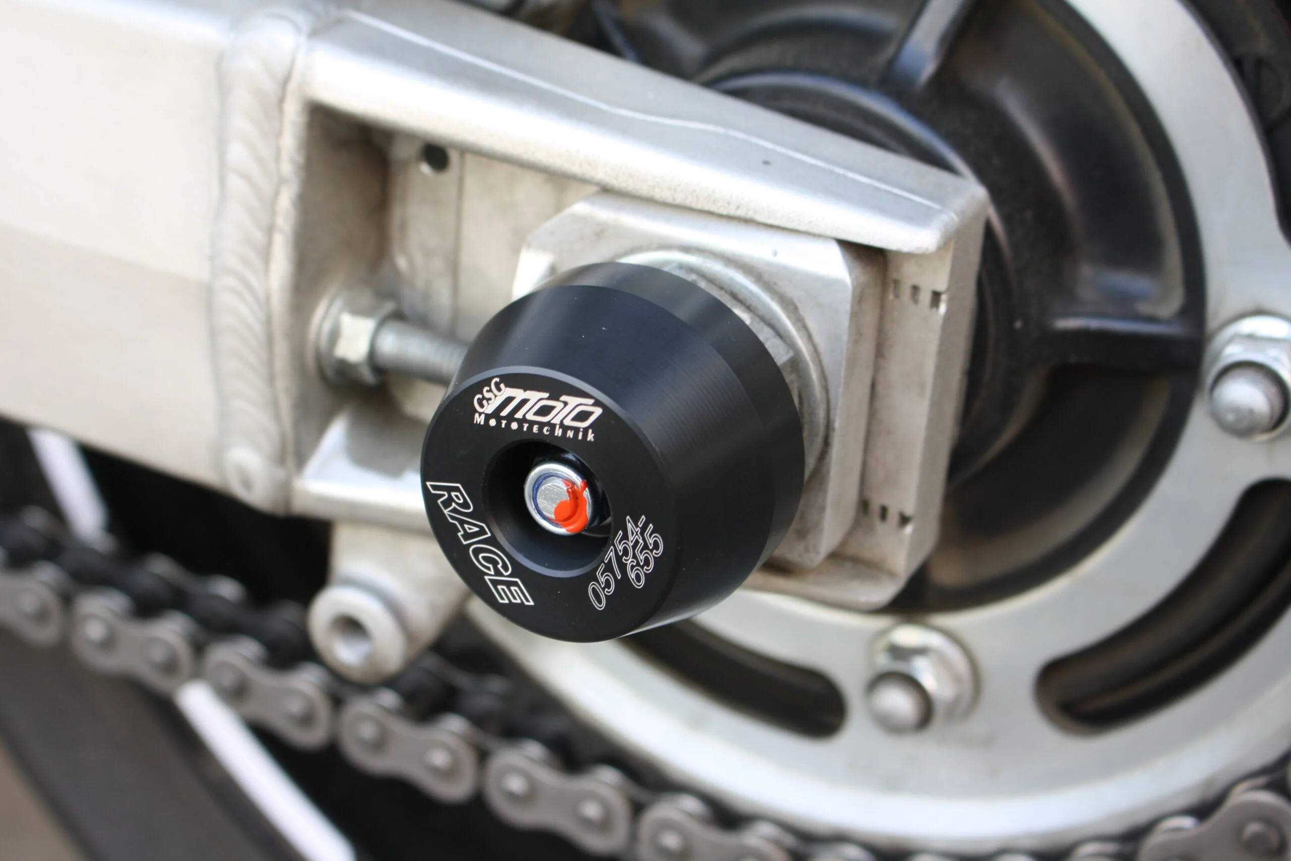 Слайдеры оси заднего колеса на шпильке GSG 31-40-377 защищают заднюю часть мотоцикла Suzuki при падениях. Они предотвращают повреждения оси, гайки, маятника, тормоза и прилегающих деталей. Установка простая, не требует специнструмента