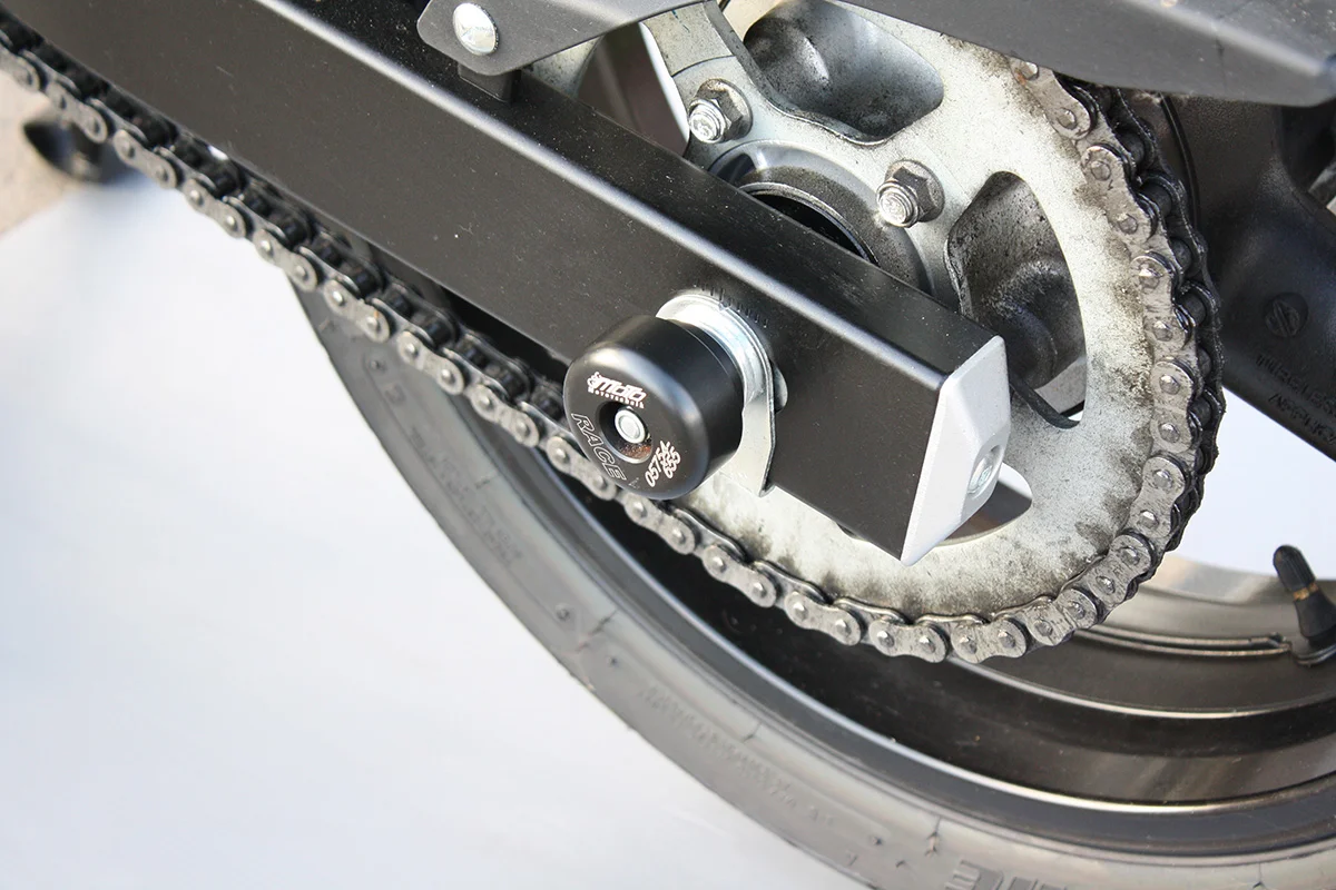 Слайдеры оси заднего колеса на шпильке GSG защищают заднюю часть мотоцикла Suzuki при падениях. Они предотвращают повреждения оси, гайки, маятника, тормоза и прилегающих деталей. Установка простая, не требует специнструмента