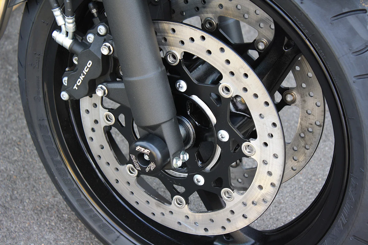 Защитные слайдеры переднего колеса GSG надежно предохраняют переднюю часть мотоцикла от ударов и протирания. При падении мотоцикл ложится на них и контролируемо скользит до остановки. Форма головки просчитана таким образом, чтобы не зацепиться за неровности асфальта, не повредить место крепления и не перевернуть мотоцикл. Качество слайдеров GSG подтверждено 30-летним производством и использованием на дороге и на гоночных треках. Слайдеры устанавливаются на полую ось переднего колеса с помощью шпильки. Крепёж входит в комплект.