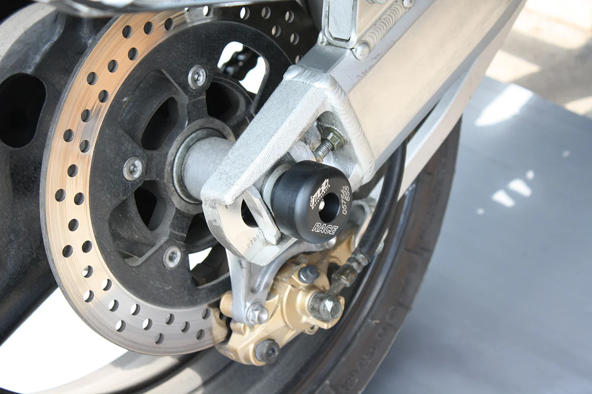 Защитные слайдеры заднего колеса GSG надежно предохраняют заднюю часть мотоцикла от ударов и протирания. При падении мотоцикл ложится на них и контролируемо скользит до остановки. Форма головки просчитана таким образом, чтобы не зацепиться за неровности асфальта, не повредить место крепления и не перевернуть мотоцикл. Качество слайдеров GSG подтверждено 30-летним производством и использованием на дороге и на гоночных треках. Слайдеры устанавливаются в ось заднего колеса с помощью шпильки. Крепёж входит в комплект.