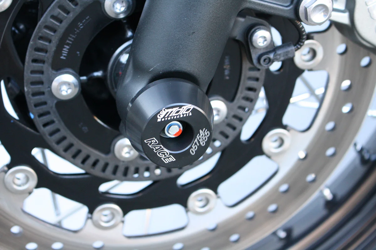 Защитные слайдеры переднего колеса GSG надежно предохраняют переднюю часть мотоцикла от ударов и протирания. При падении мотоцикл ложится на них и контролируемо скользит до остановки. Форма головки просчитана таким образом, чтобы не зацепиться за неровности асфальта, не повредить место крепления и не перевернуть мотоцикл. Качество слайдеров GSG подтверждено 30-летним производством и использованием на дороге и на гоночных треках. Слайдеры устанавливаются на полую ось переднего колеса с помощью шпильки. Крепёж входит в комплект.