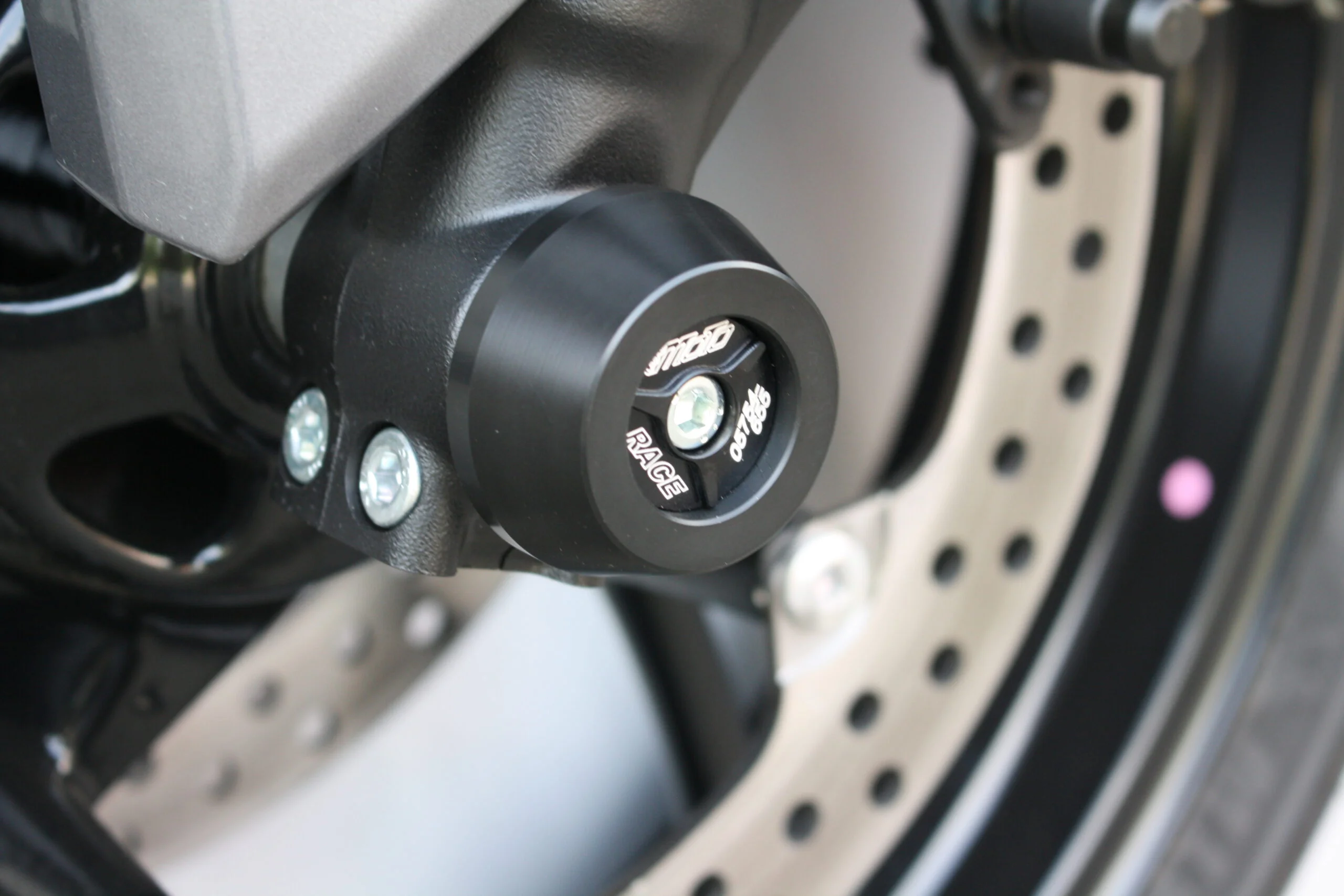 Защитные слайдеры переднего колеса GSG надежно предохраняют переднюю часть мотоцикла от ударов и протирания. При падении мотоцикл ложится на них и контролируемо скользит до остановки. Форма головки просчитана таким образом, чтобы не зацепиться за неровности асфальта, не повредить место крепления и не перевернуть мотоцикл. Качество слайдеров GSG подтверждено 30-летним производством и использованием на дороге и на гоночных треках. Слайдеры устанавливаются на ось переднего колеса с помощью резиновых втулок. Крепёж входит в комплект.