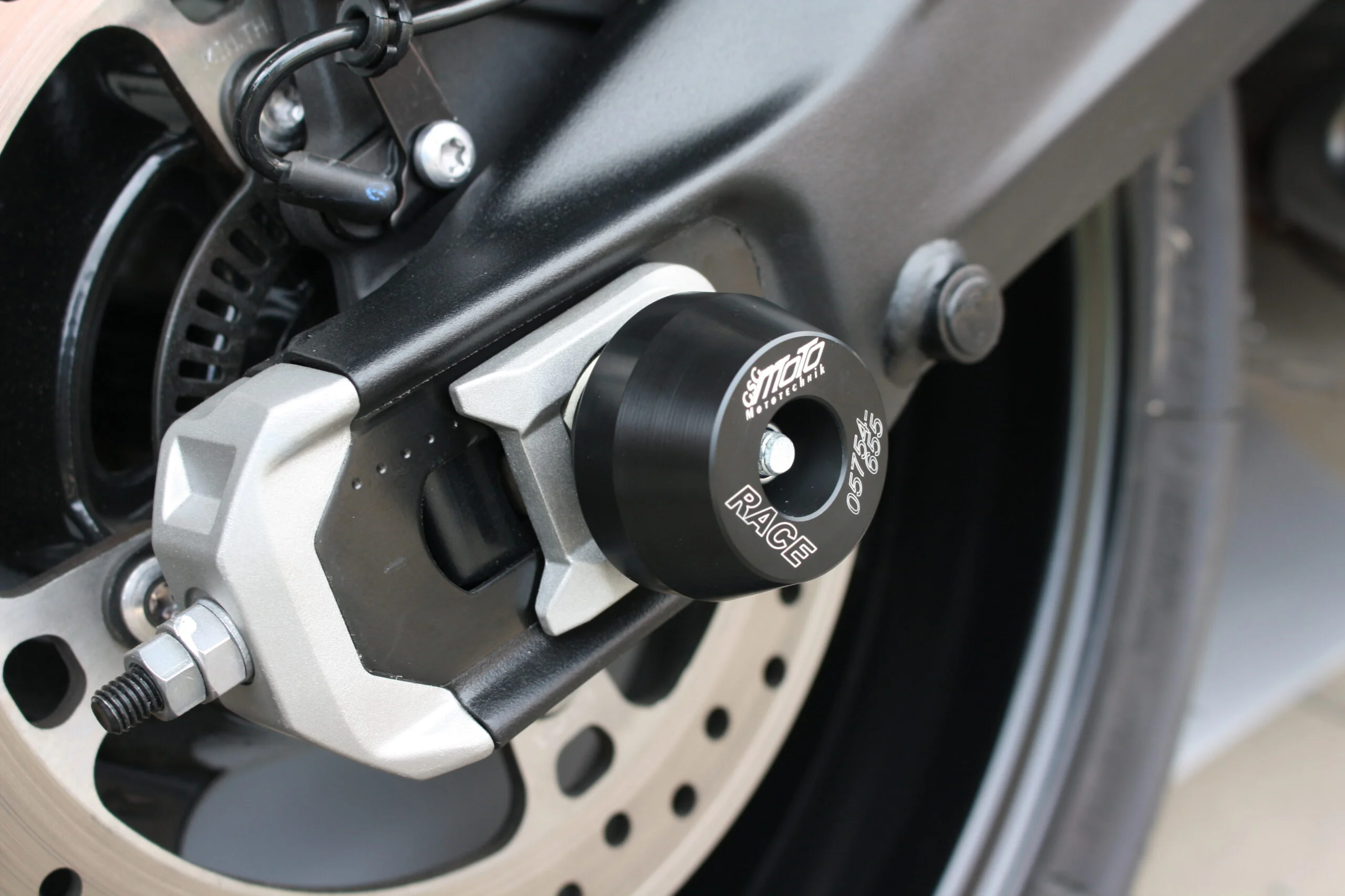 Защитные слайдеры заднего колеса GSG надежно предохраняют заднюю часть мотоцикла от ударов и протирания. При падении мотоцикл ложится на них и контролируемо скользит до остановки. Форма головки просчитана таким образом, чтобы не зацепиться за неровности асфальта, не повредить место крепления и не перевернуть мотоцикл. Качество слайдеров GSG подтверждено 30-летним производством и использованием на дороге и на гоночных треках. Слайдеры устанавливаются в ось заднего колеса с помощью шпильки. Крепёж входит в комплект.