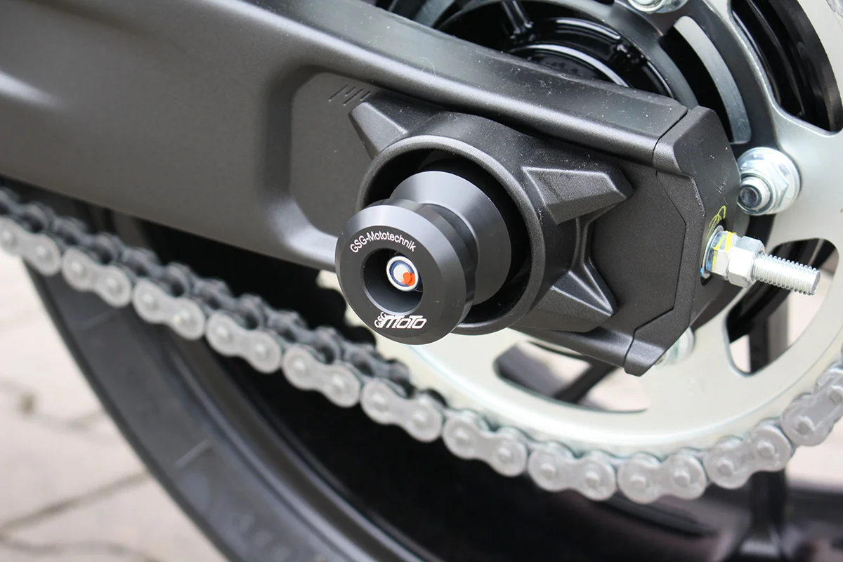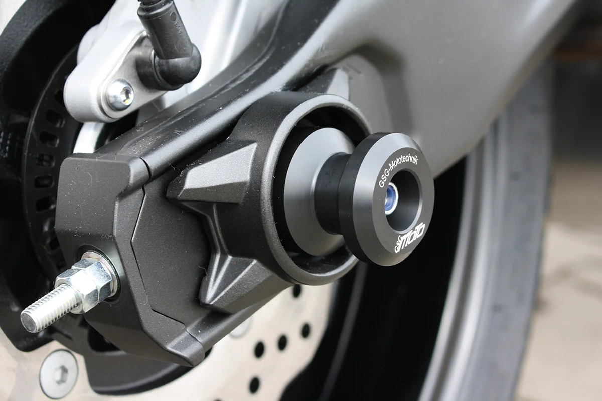 Защитные слайдеры заднего колеса GSG надежно предохраняют заднюю часть мотоцикла от ударов и протирания. При падении мотоцикл ложится на них и контролируемо скользит до остановки. Форма головки просчитана таким образом, чтобы не зацепиться за неровности асфальта, не повредить место крепления и не перевернуть мотоцикл. Качество слайдеров GSG подтверждено 30-летним производством и использованием на дороге и на гоночных треках. Слайдеры устанавливаются в ось заднего колеса с помощью шпильки. Крепёж входит в комплект.